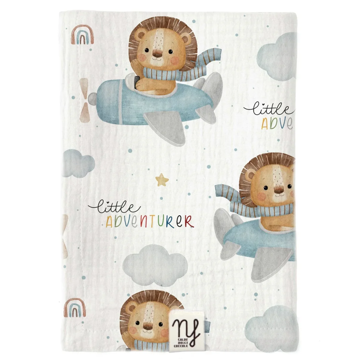 Mussola fantasia leone aviatore in cotone. Il tessuto, traspirante e assorbente, diventa più morbido ad ogni lavaggio. Puó essere utilizzato per proteggiere la mamma durante l’allattamento, come base d’appoggio per il cambio pannolino, come proteggi spalla in caso di rigurgito, oppure come asciugamano o copertina leggera, e per proteggere il bambino dallo sfregamento se appoggiato ai seggiolino auto o passeggini.Â