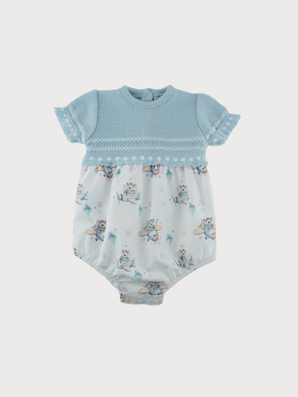 Pagliaccetto in maglia e cotone celeste e bianco con stampa orsetto aviatore