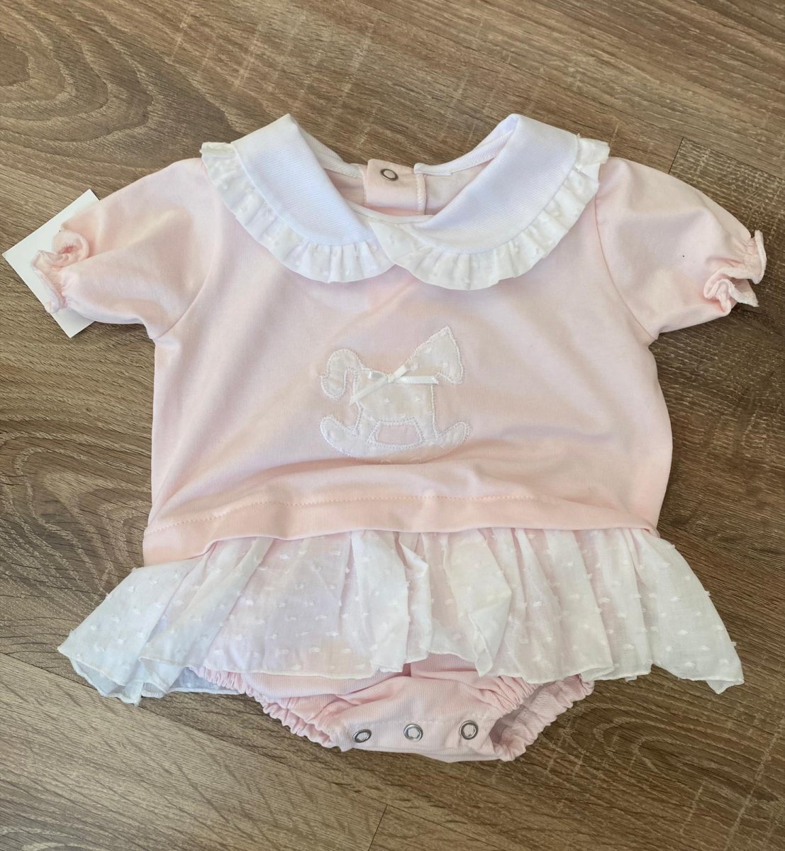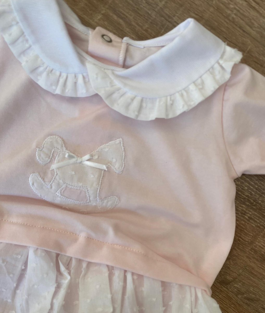Pagliaccetto in cotone colore rosa con balza e colletto colore bianco in plumetis e ricamo cavalluccio a dondolo sul davanti