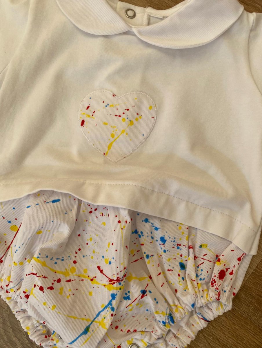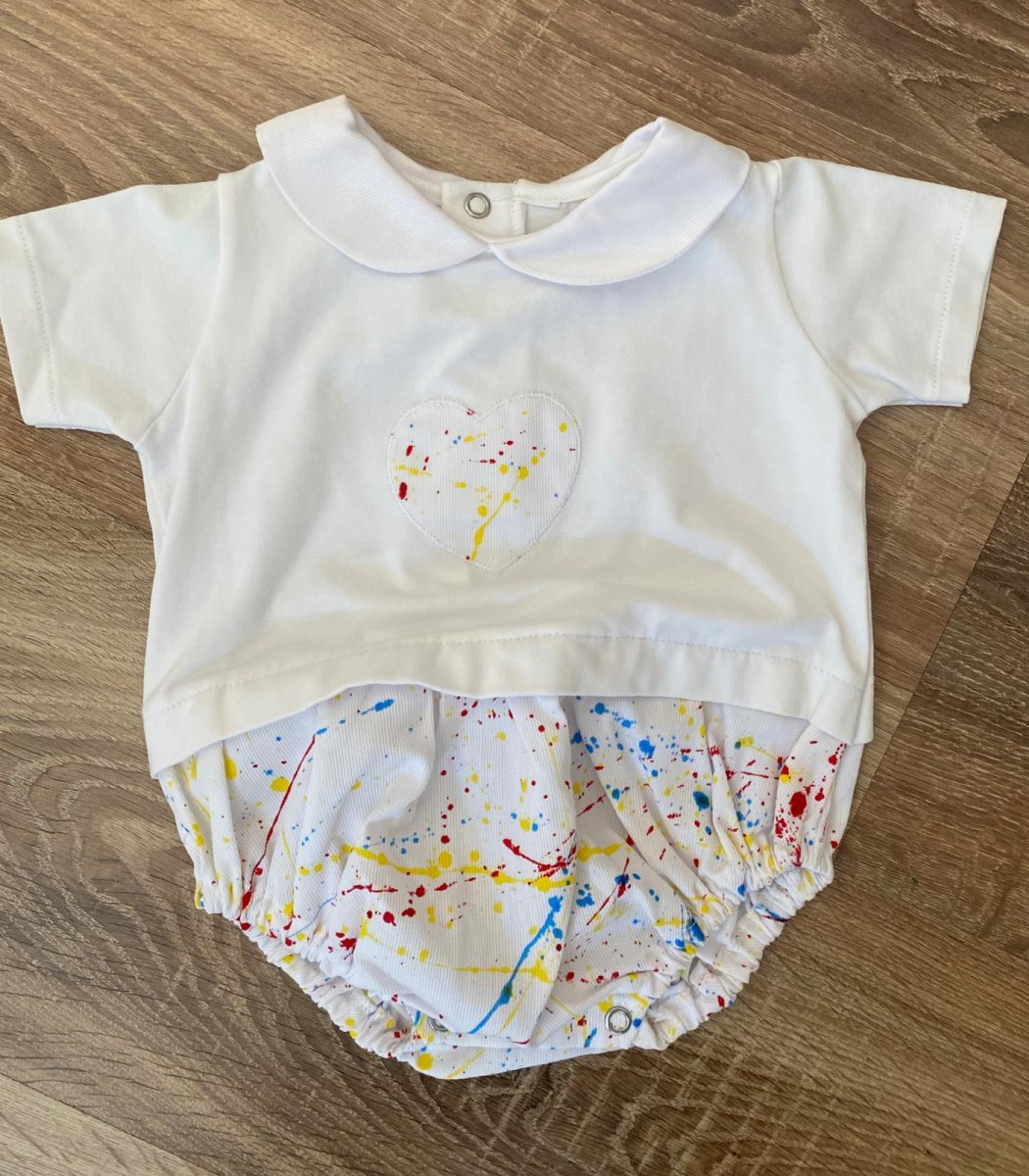 Pagliaccetto in cotone colore bianco con ricamo cuoricino e dettagli colorati nella parte inferiore