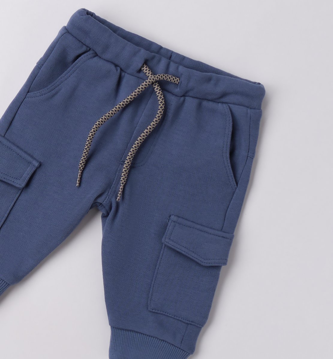 Pantalone in felpa, con elastico e culisse in vita, con tasche a filo e tasconi laterali, con elastico alle caviglie, colore blu avion