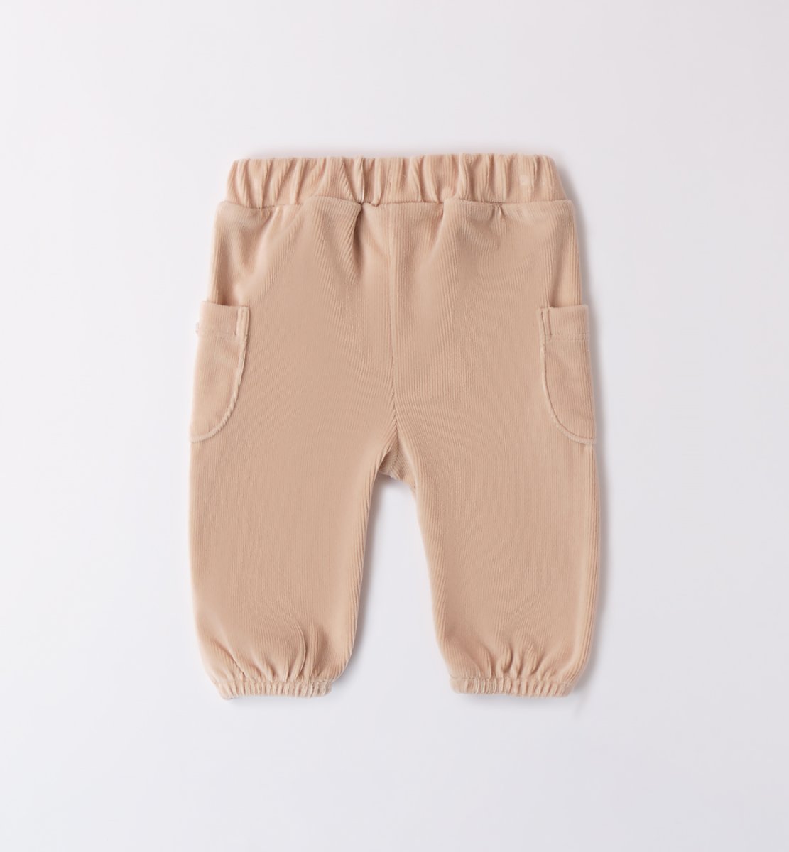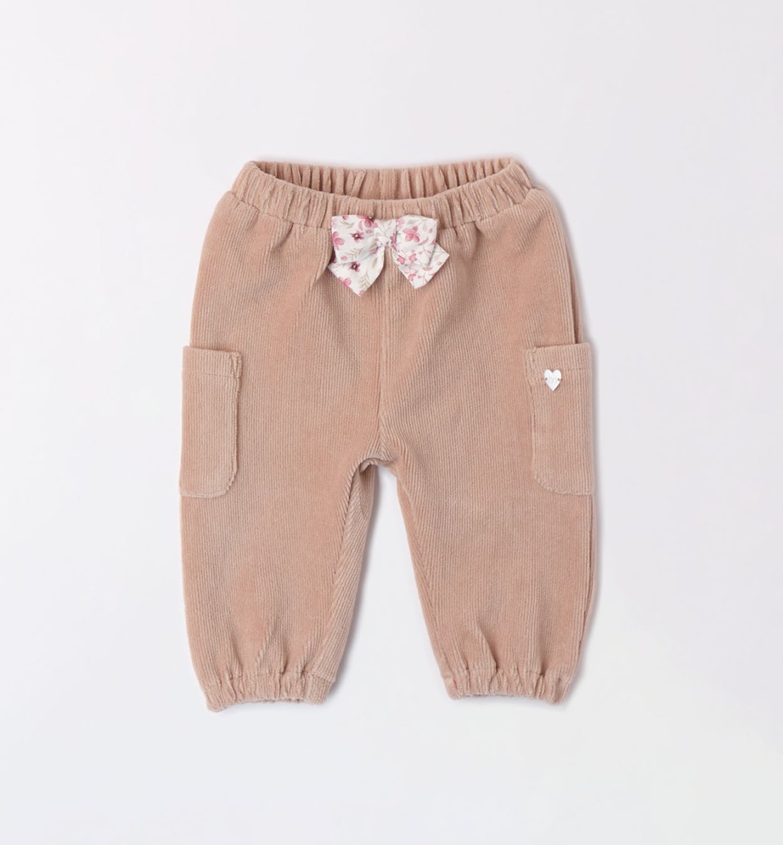 Pantalone in velluto colore tortora con tasche laterali e fiocco in vita a fiorellini