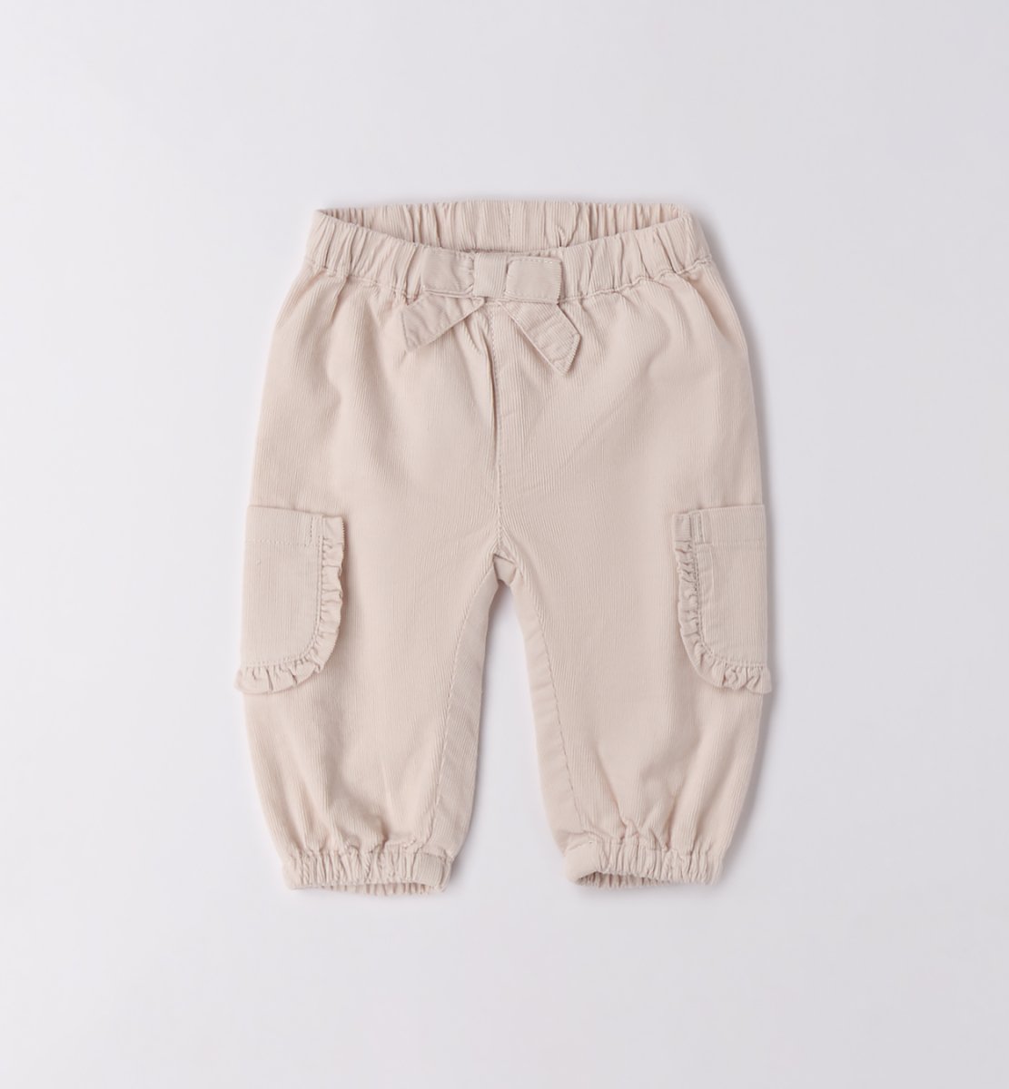 Pantalone in vellutino colore beige con tasconi laterali e applicazione fiocco sulla parte anteriore