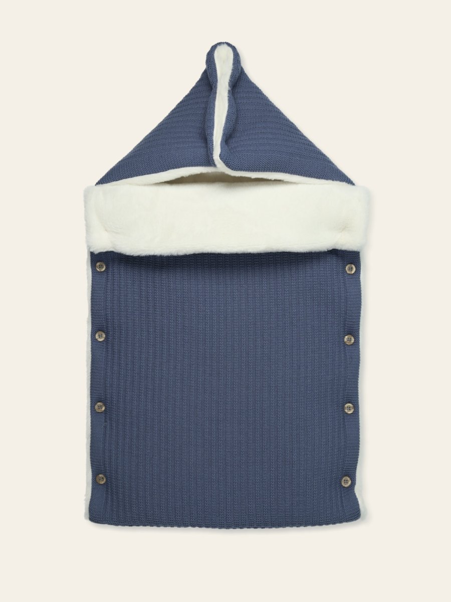Sacco nanna in misto lana, colore blu notte, foderato con pelliccia sintetica internamente, con bottoncini in legno laterali