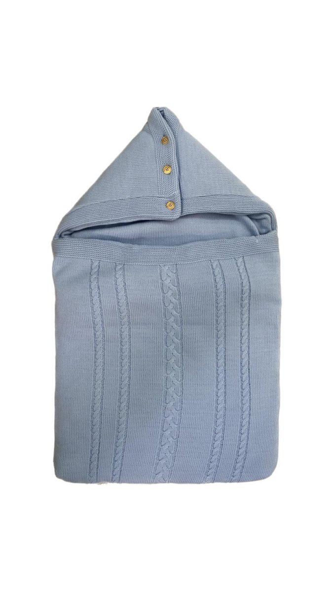 Sacco nanna colore celeste polvere in misto lana con ricamo trecce, bottoncini in legno e cerniera laterale