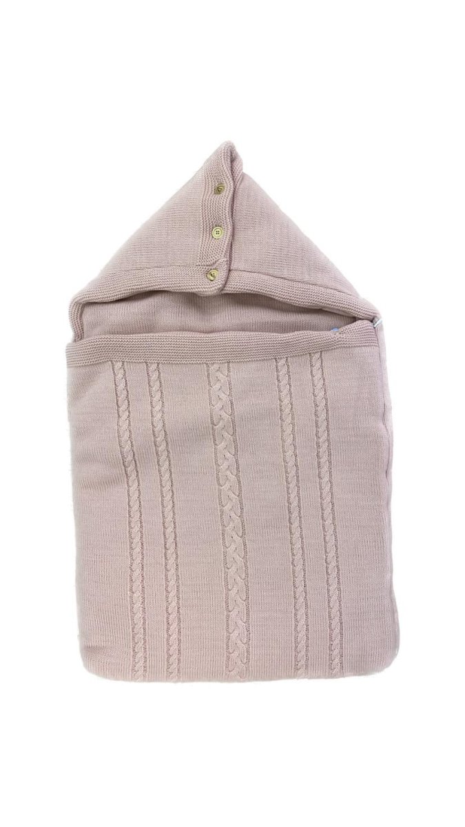 Sacco nanna colore rosa antico in misto lana con ricamo trecce, bottoncini in legno e cerniera laterale