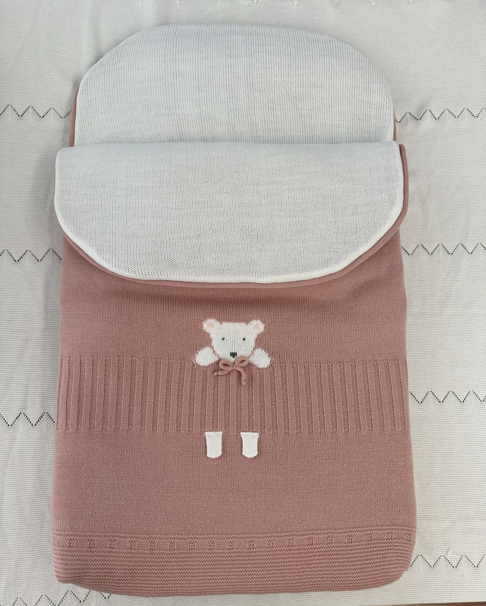 Sacco nanna in misto lana bianco all’intero e rosa all’esterno con chiusura cerniera e ricamo orsetto sul davanti