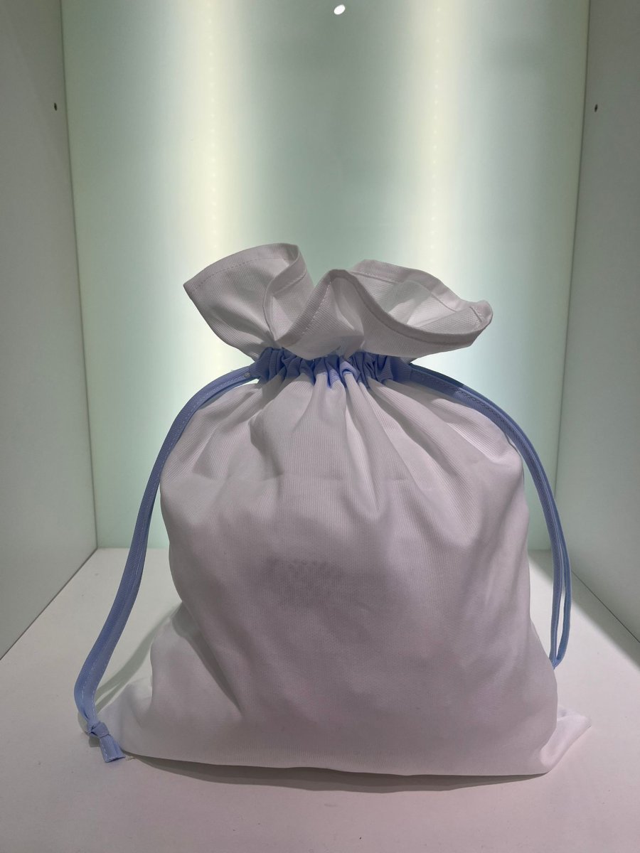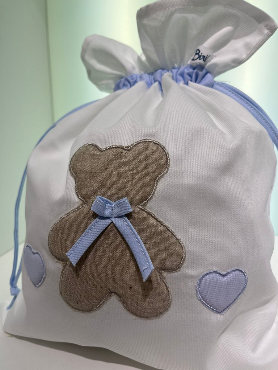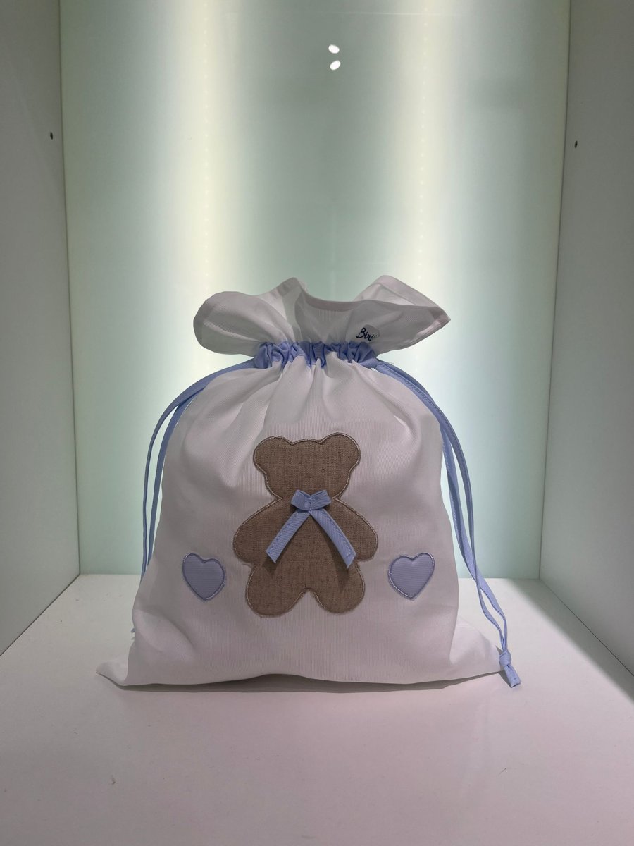 Sacco porta cambio in cotone colore bianco con ricamo orsetto tortora e cuoricini celeste