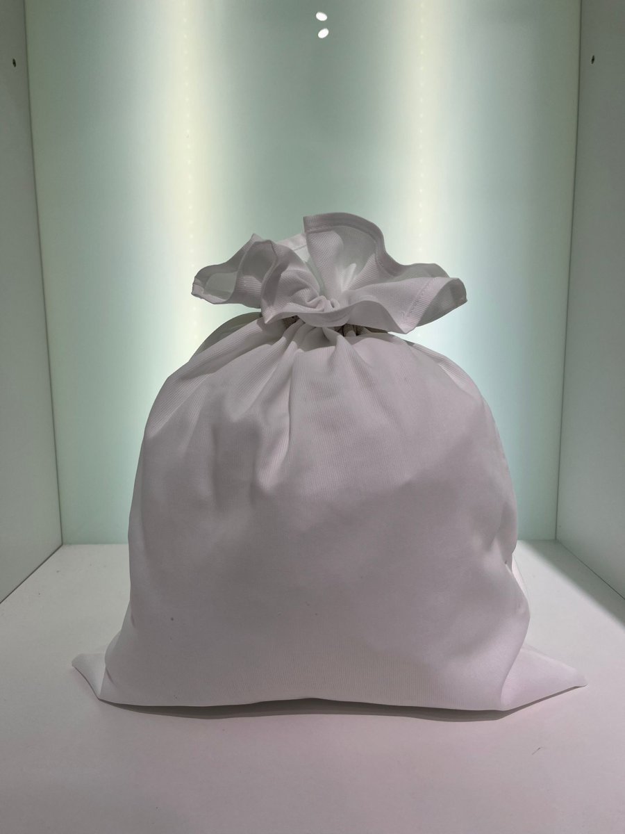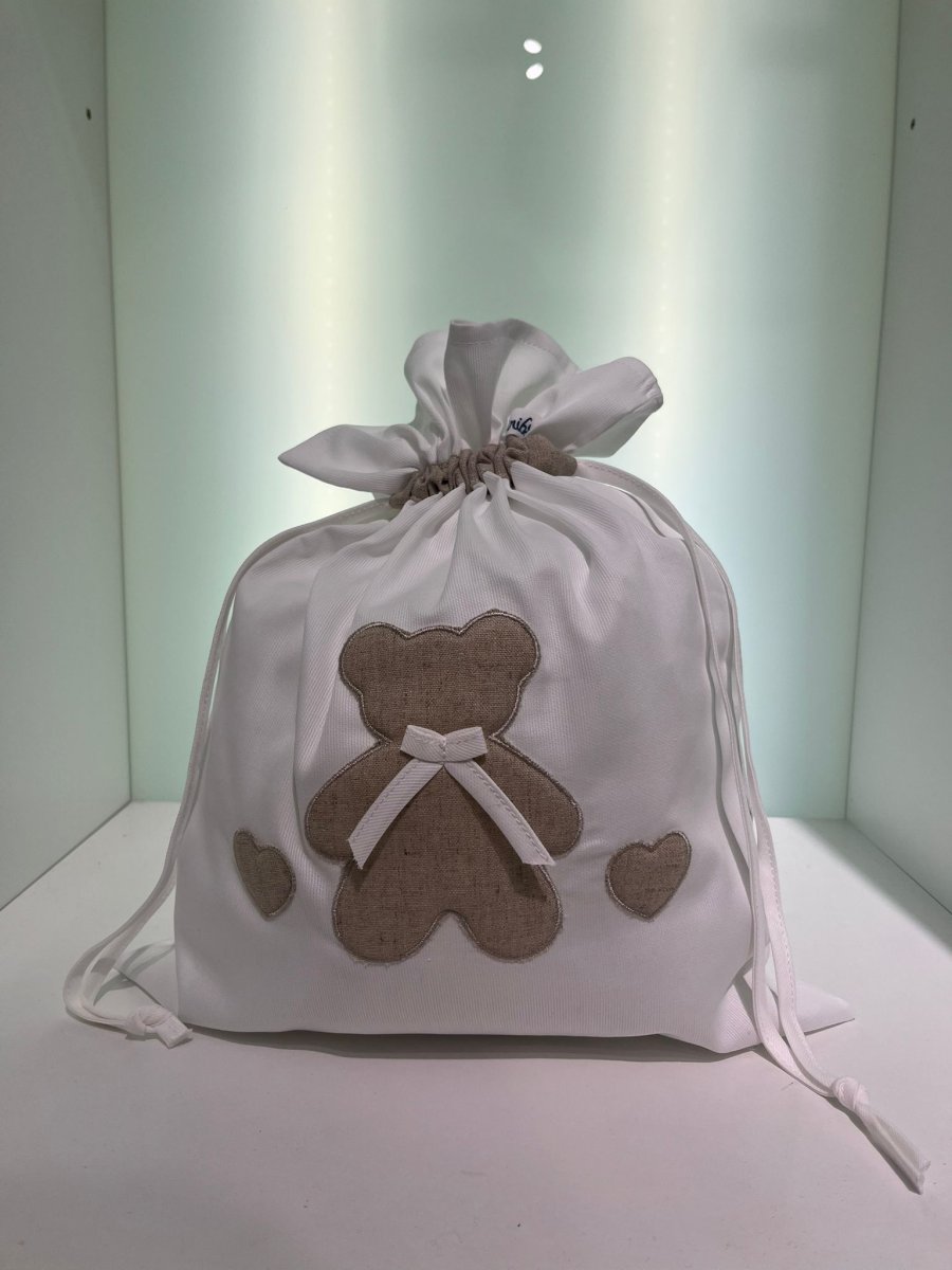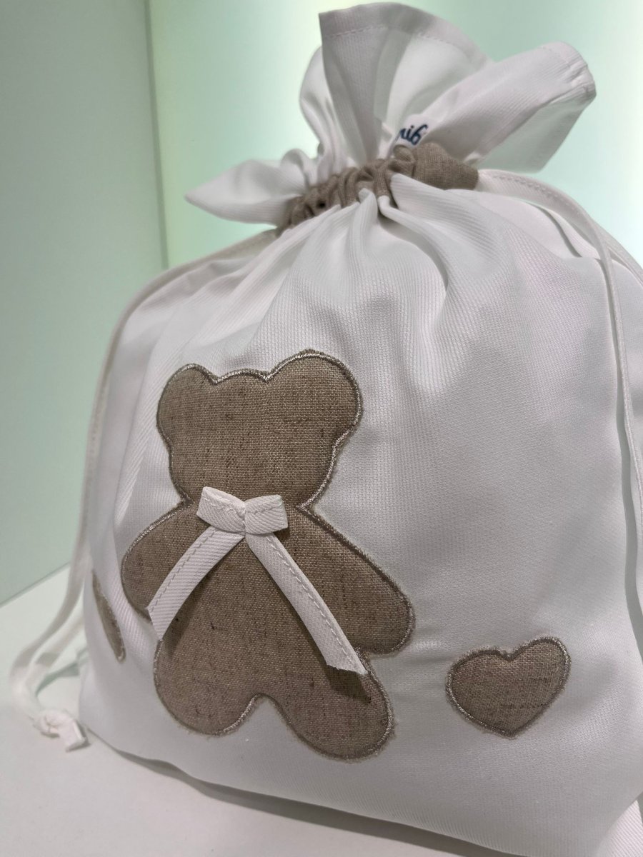 Sacco porta cambio in cotone colore bianco con ricamo orsetto tortora e cuoricini tortora