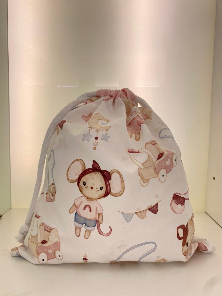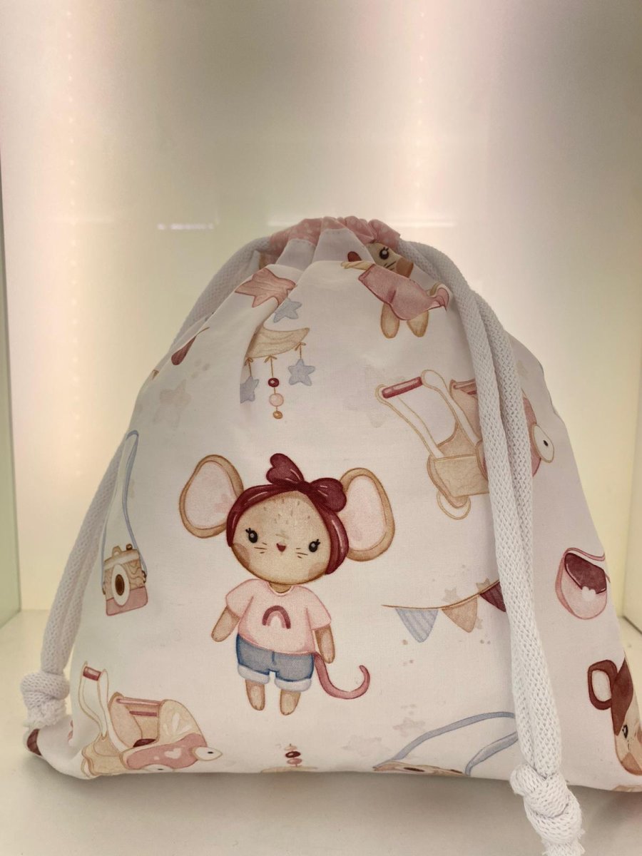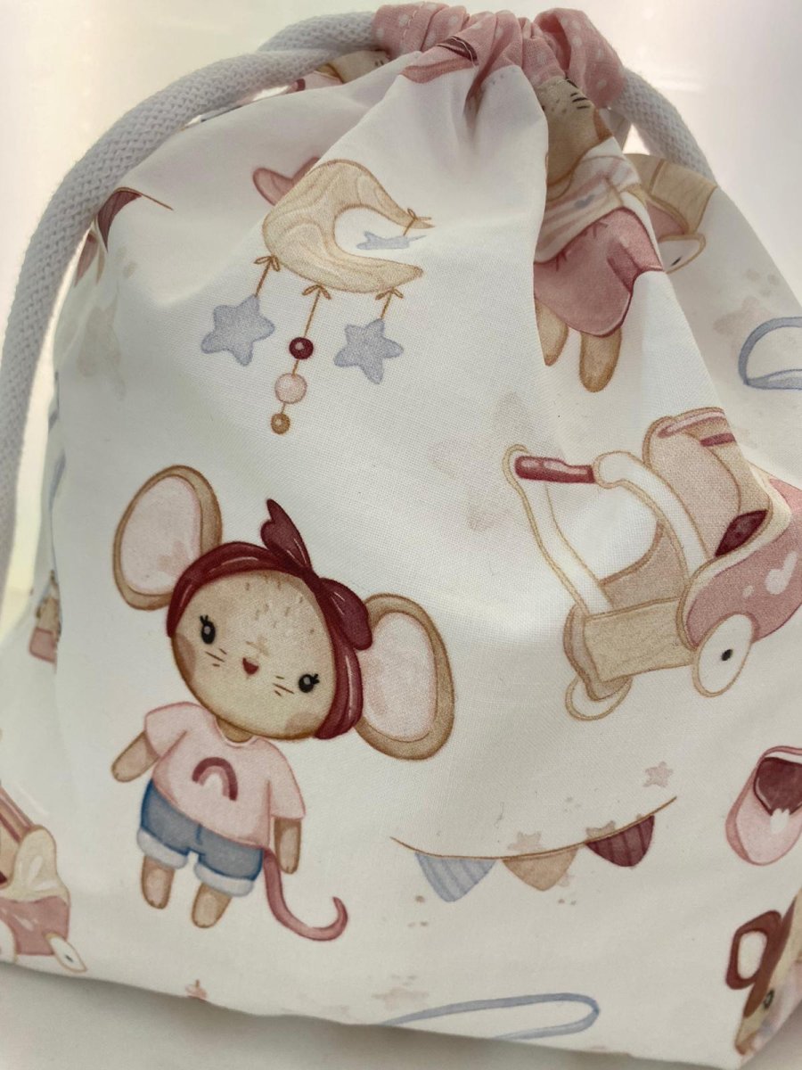 Sacco porta cambio in cotone fondo bianco con stampa topolina rosa