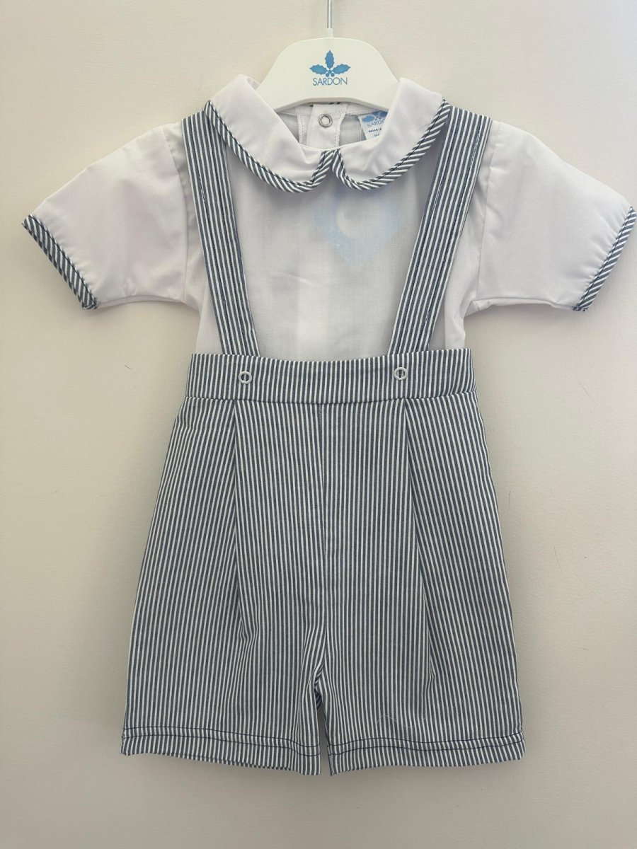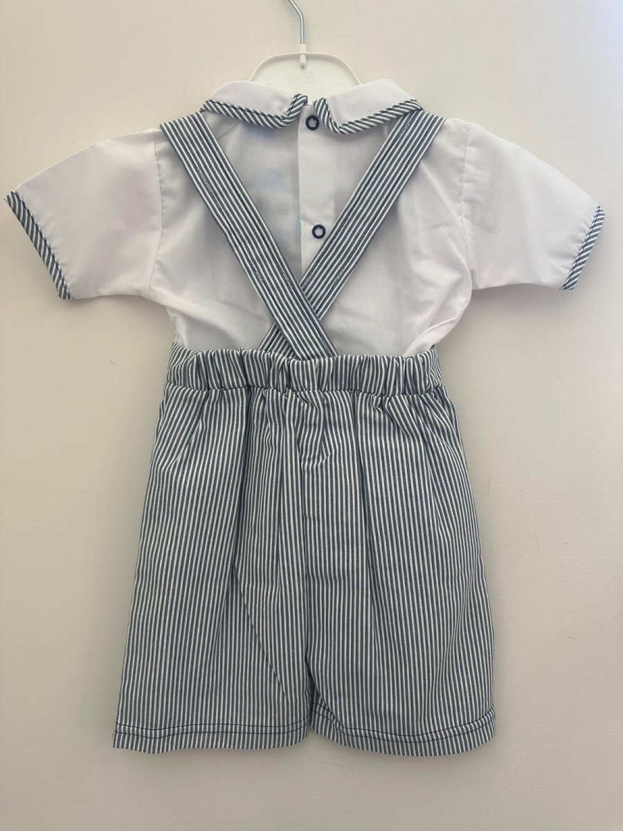 Salopette a righe in cotone con camicia a mezza manica con riportino rigato sul colletto e sulle maniche