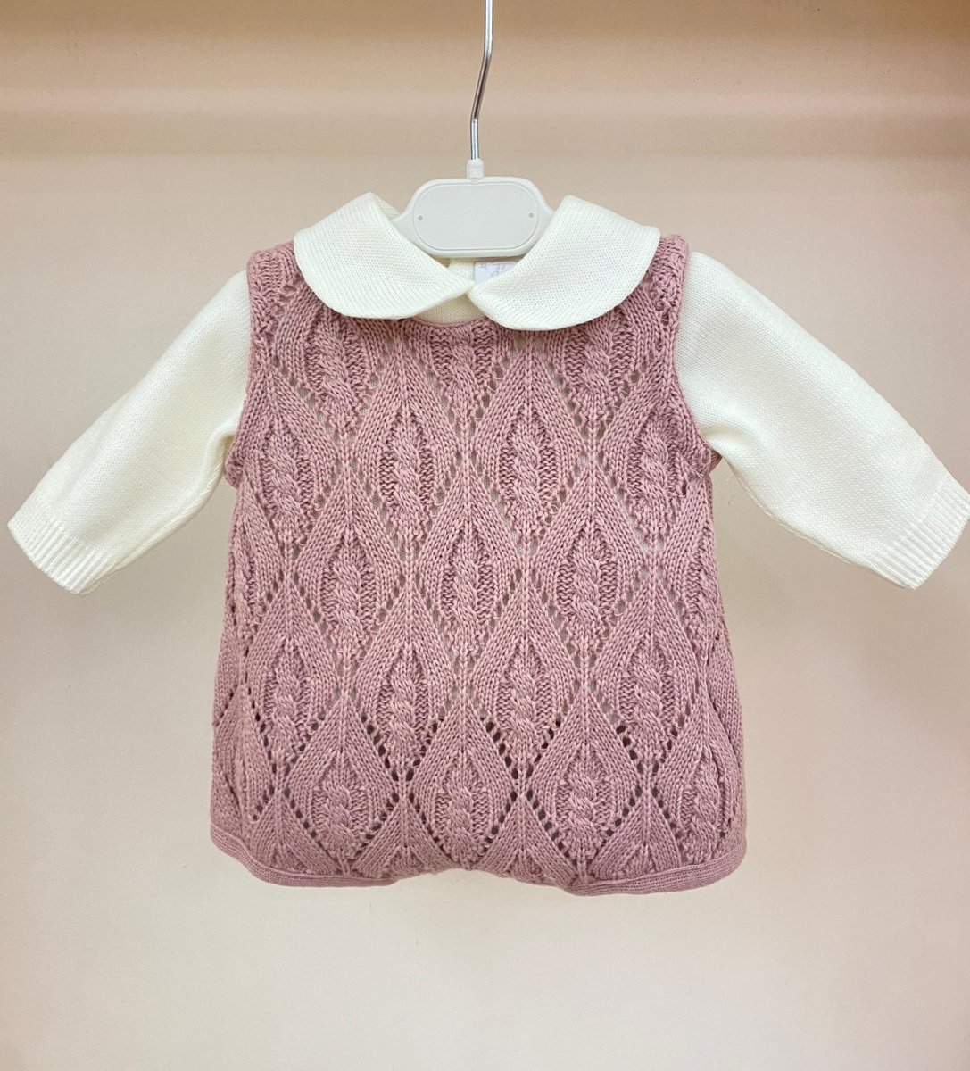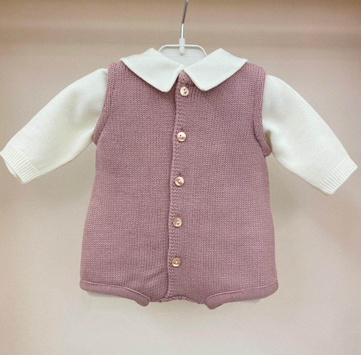 Salopette colore rosa pallido in misto lana con trama ricamata e polo colore panna in misto lana