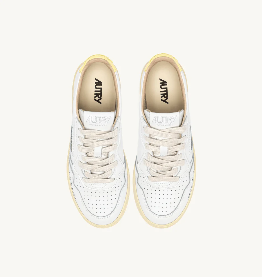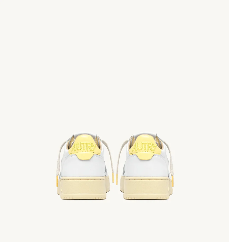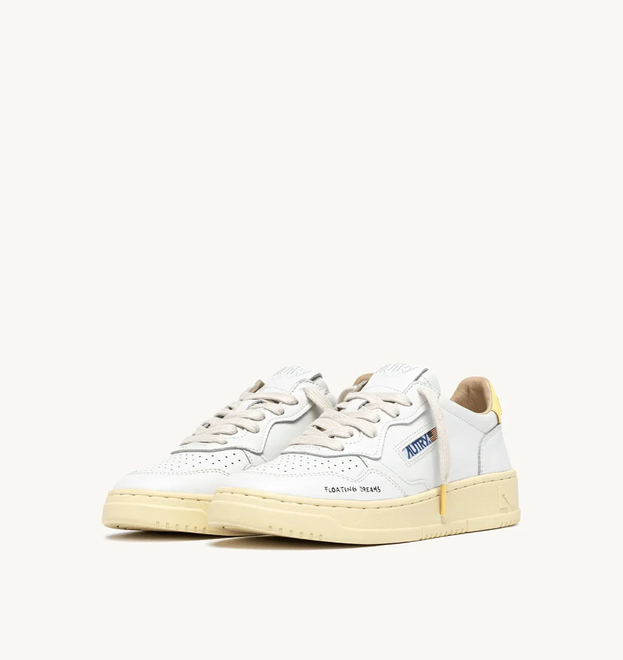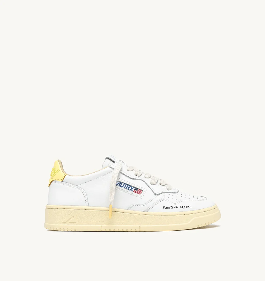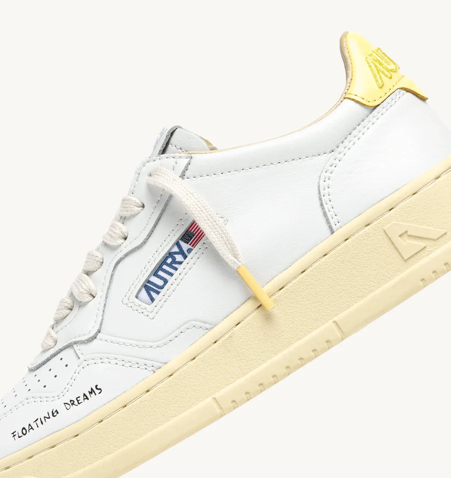 Il talloncino in pelle giallo, il dettaglio laterale jacquard e la label cucita sulla linguetta sono personalizzati con il logo Autry, mentre la stampa lettering laterale “Floating dreams” caratterizza ulteriormente il look.