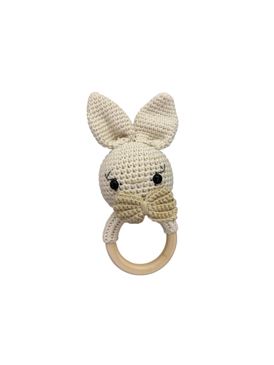 Sonaglino con manico in legno e coniglietto con fiocco tortora all’uncinetto realizzato a mano.