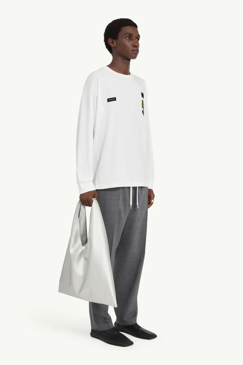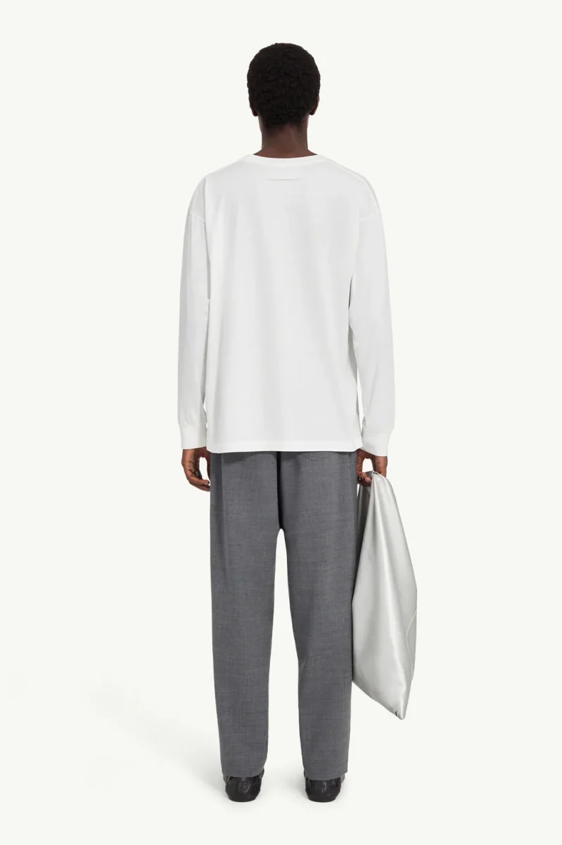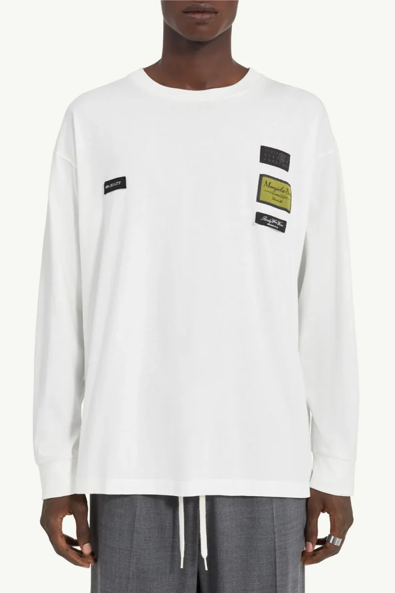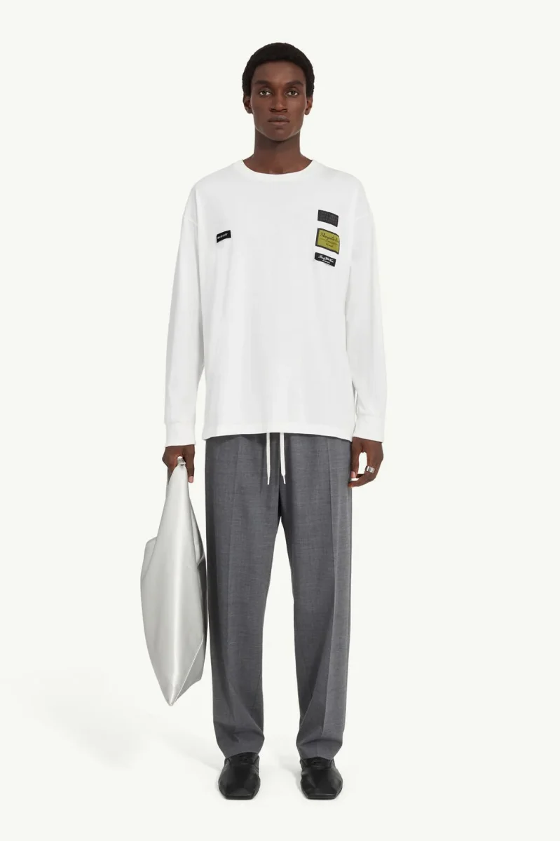 T-shirt a maniche lunghe in jersey di cotone con etichette jacquard cucite sul petto. Solitamente collocate all’interno, le etichette sono volutamente esposte, per trasformare i marcatori funzionali in elementi di design. Sul retro, la linea di impunture bianche della Maison completa il look.