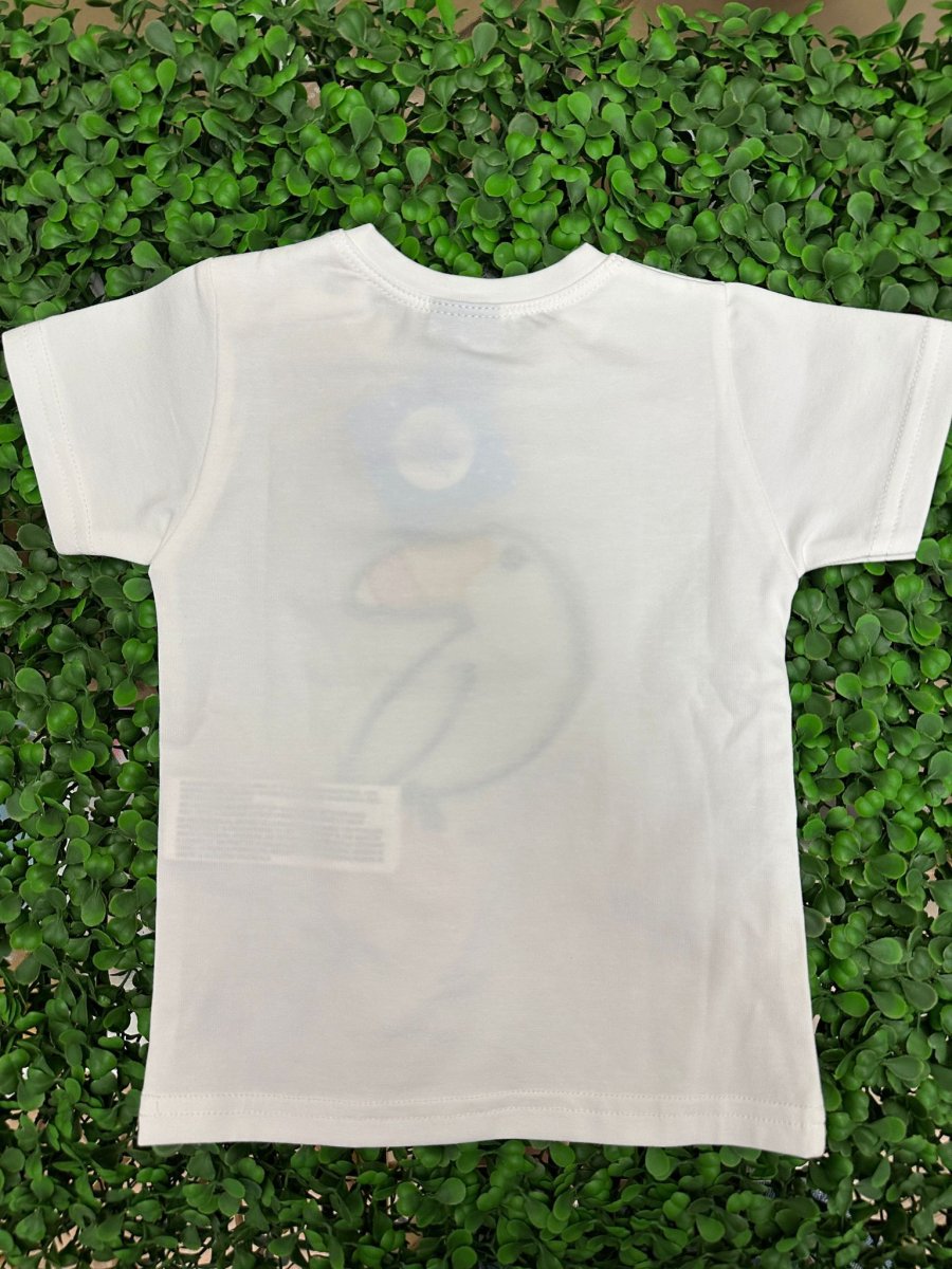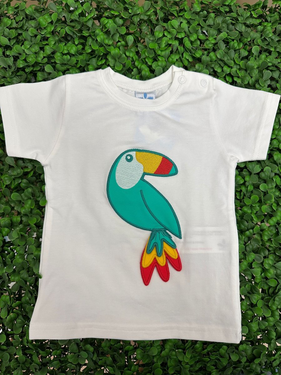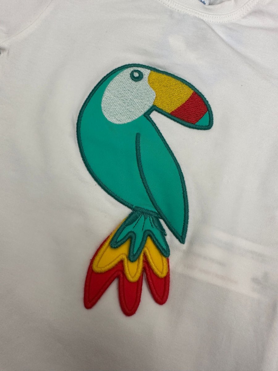 T-shirt bianca con ricamo tucano colorato