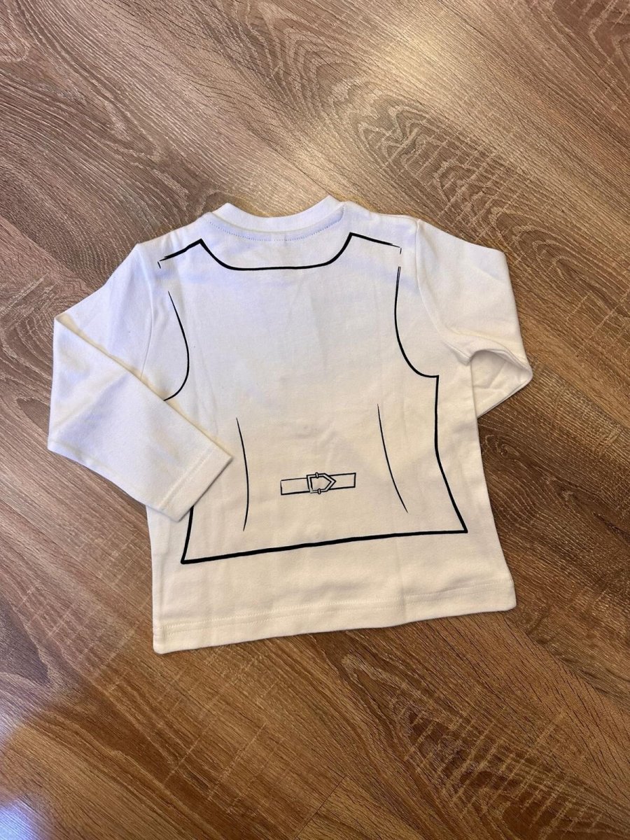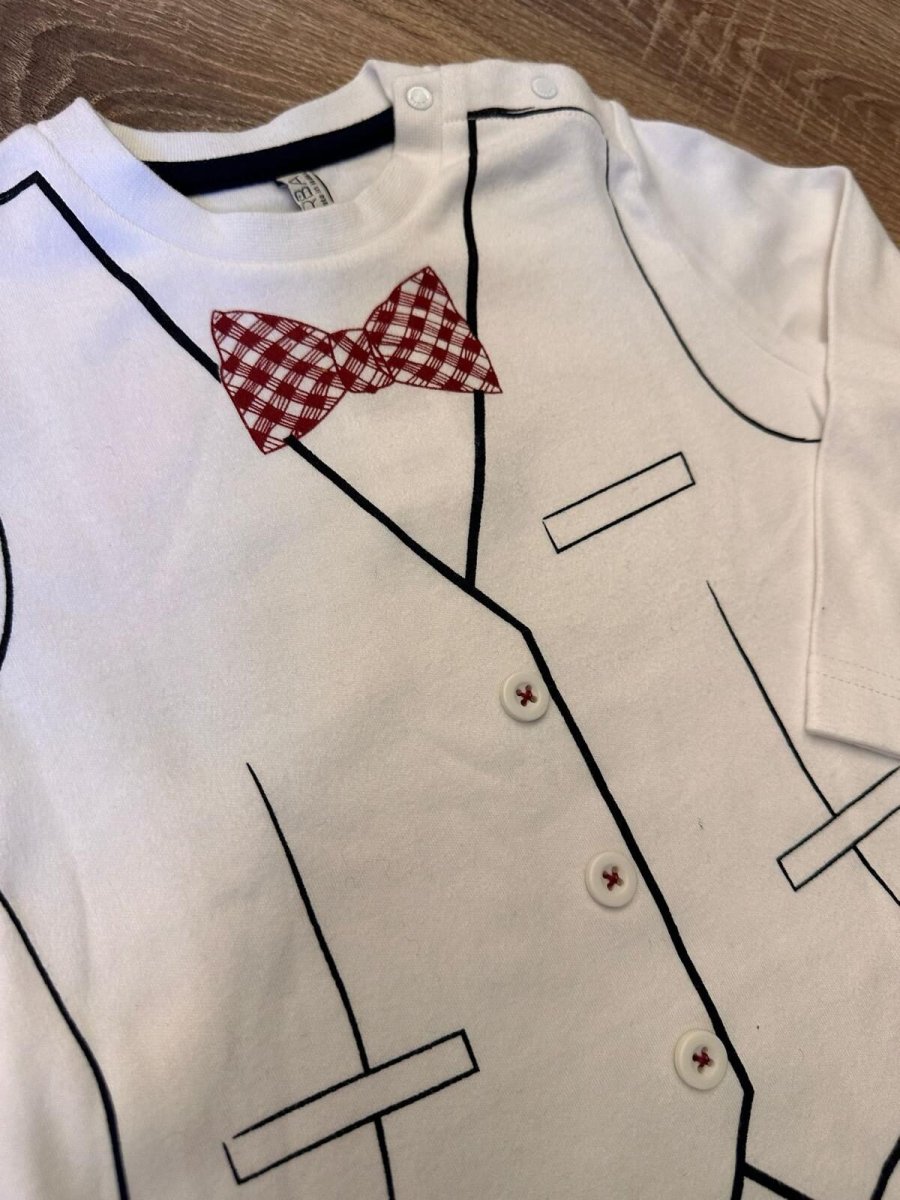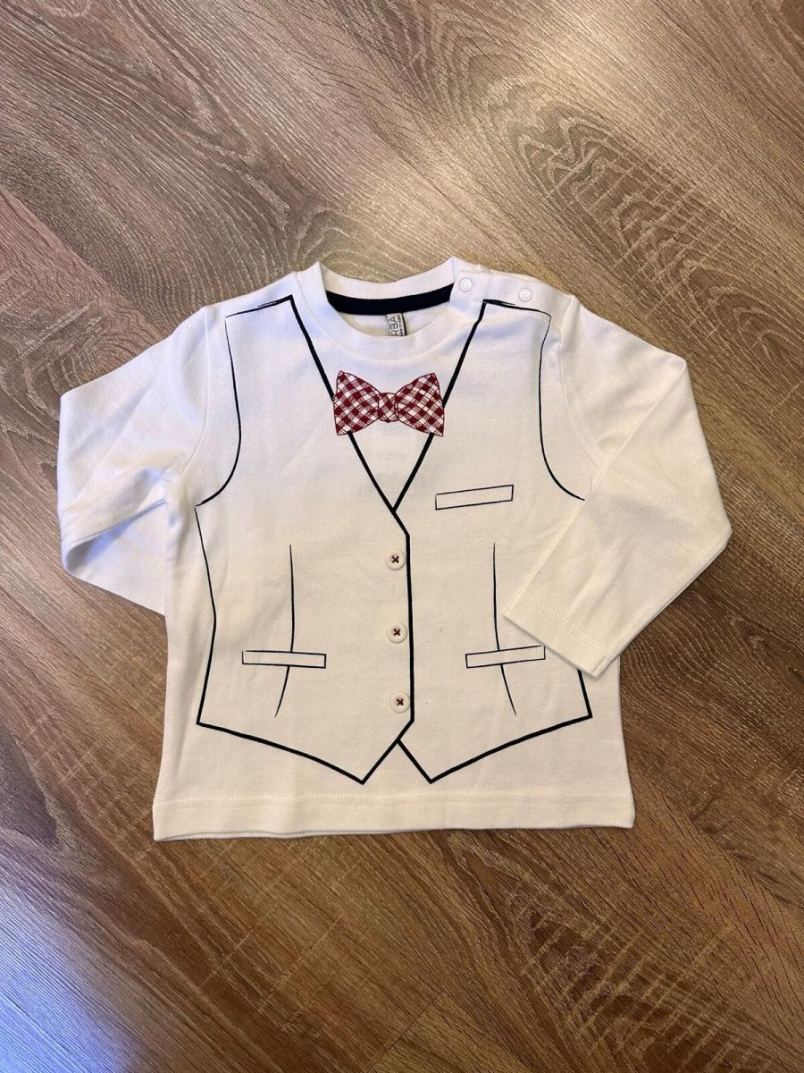 T-shirt a manica lunga, bianca con stampa di panciotto e papillon