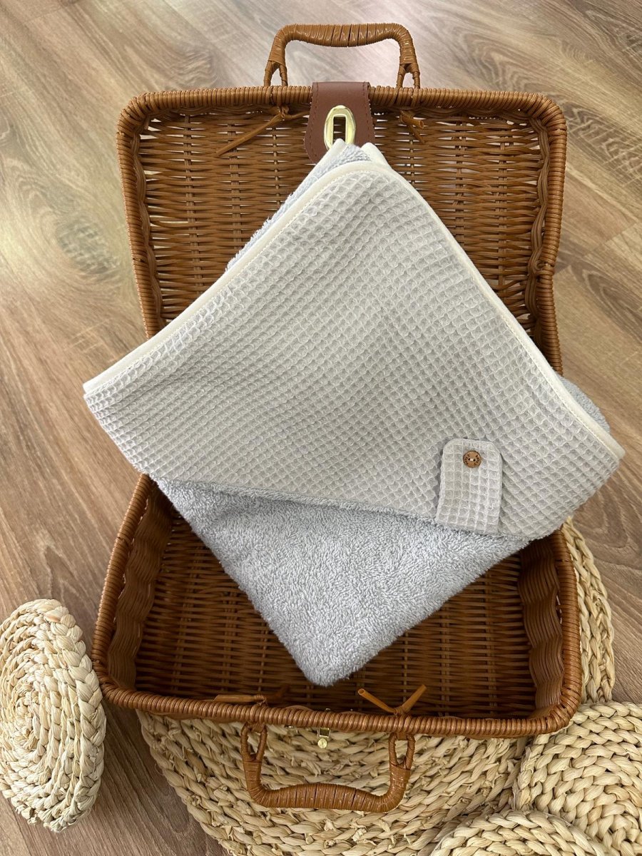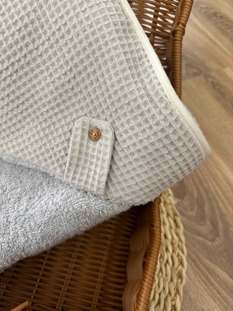 Triangolo da bagnetto in spugna morbida e assorbente,a nido d’ape grigio con bottoncino in legno