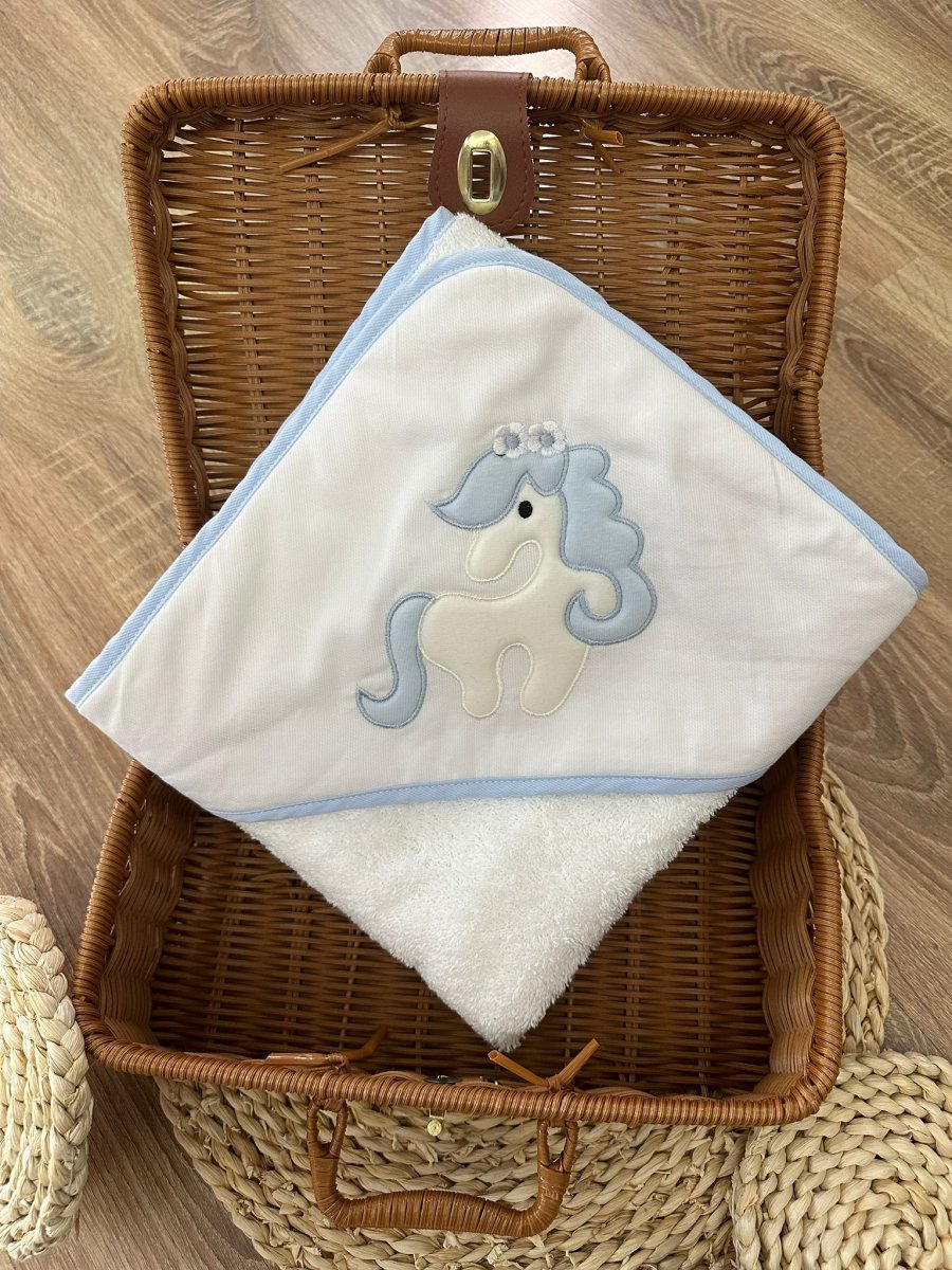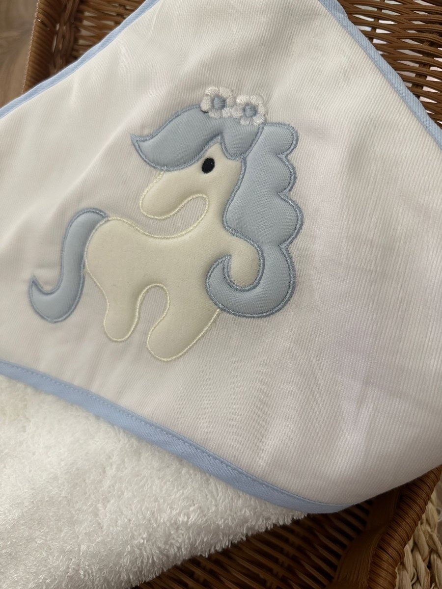 Triangolo da bagnetto in spugna morbida e assorbente con dettaglio cavalluccio celeste e bianco e profilo celeste