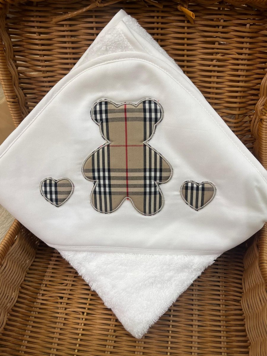 Triangolo da bagnetto in spugna morbida e assorbente con dettaglio orso con cuori fantasia tartan