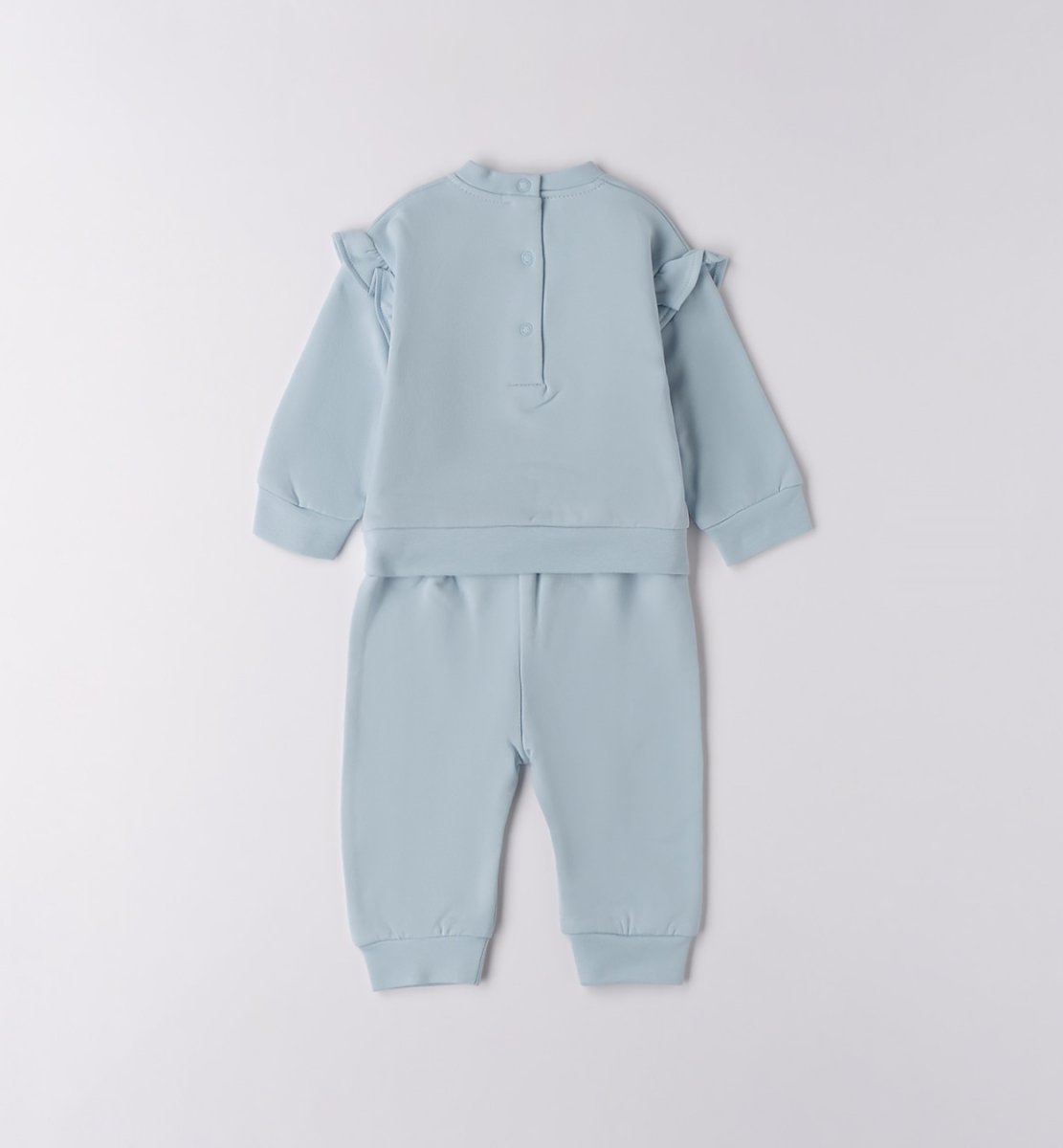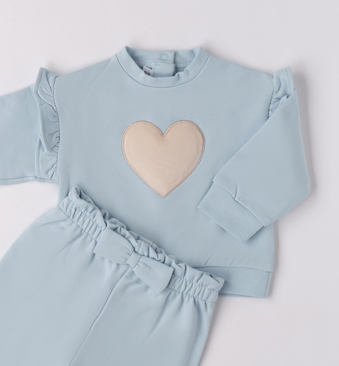 Tuta jogging in caldo cotone felpato: felpa colore celeste con ricamo cuore tortora e ruches sulle spalline e pantalone coordinato con fiocco in vita