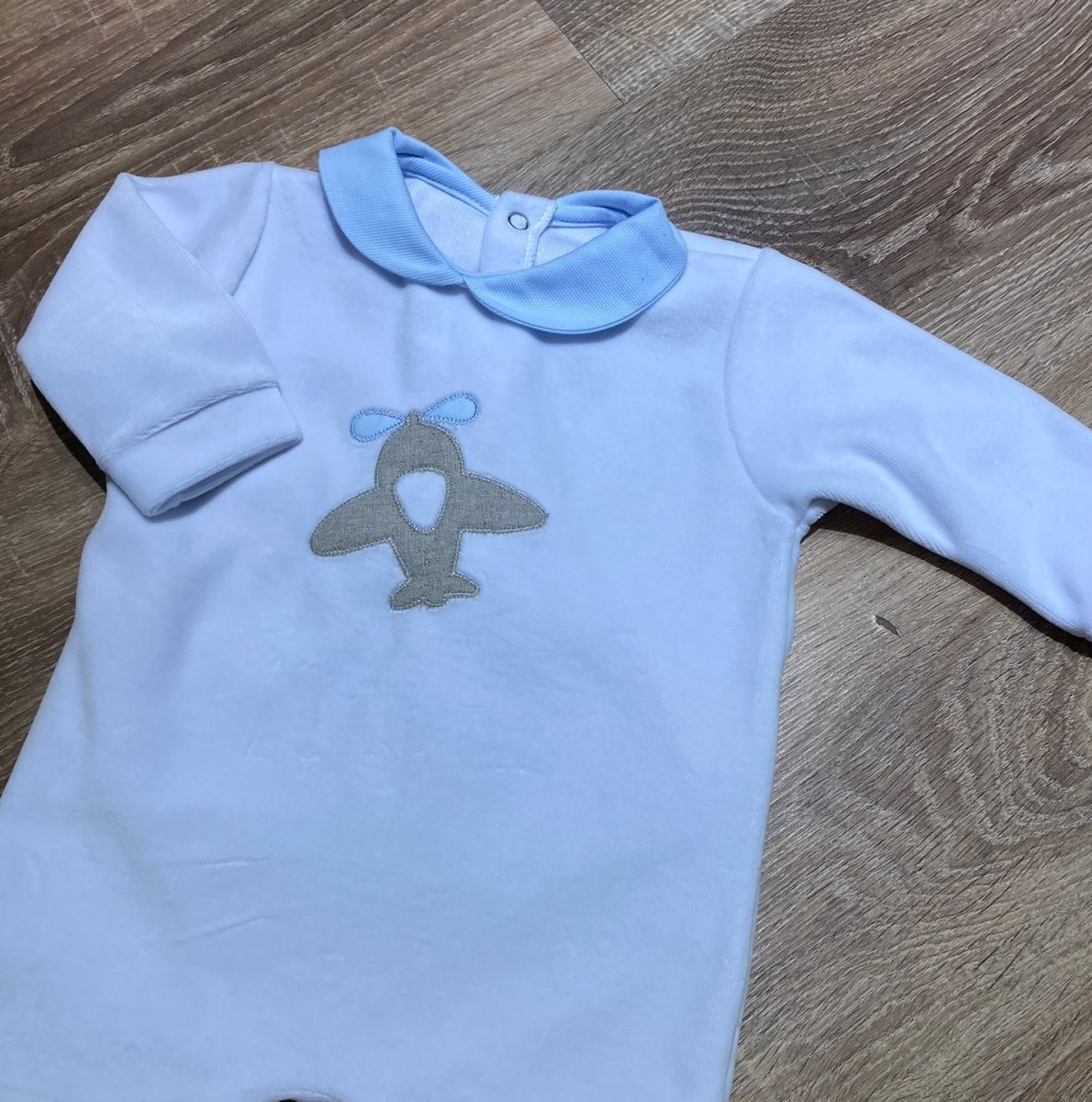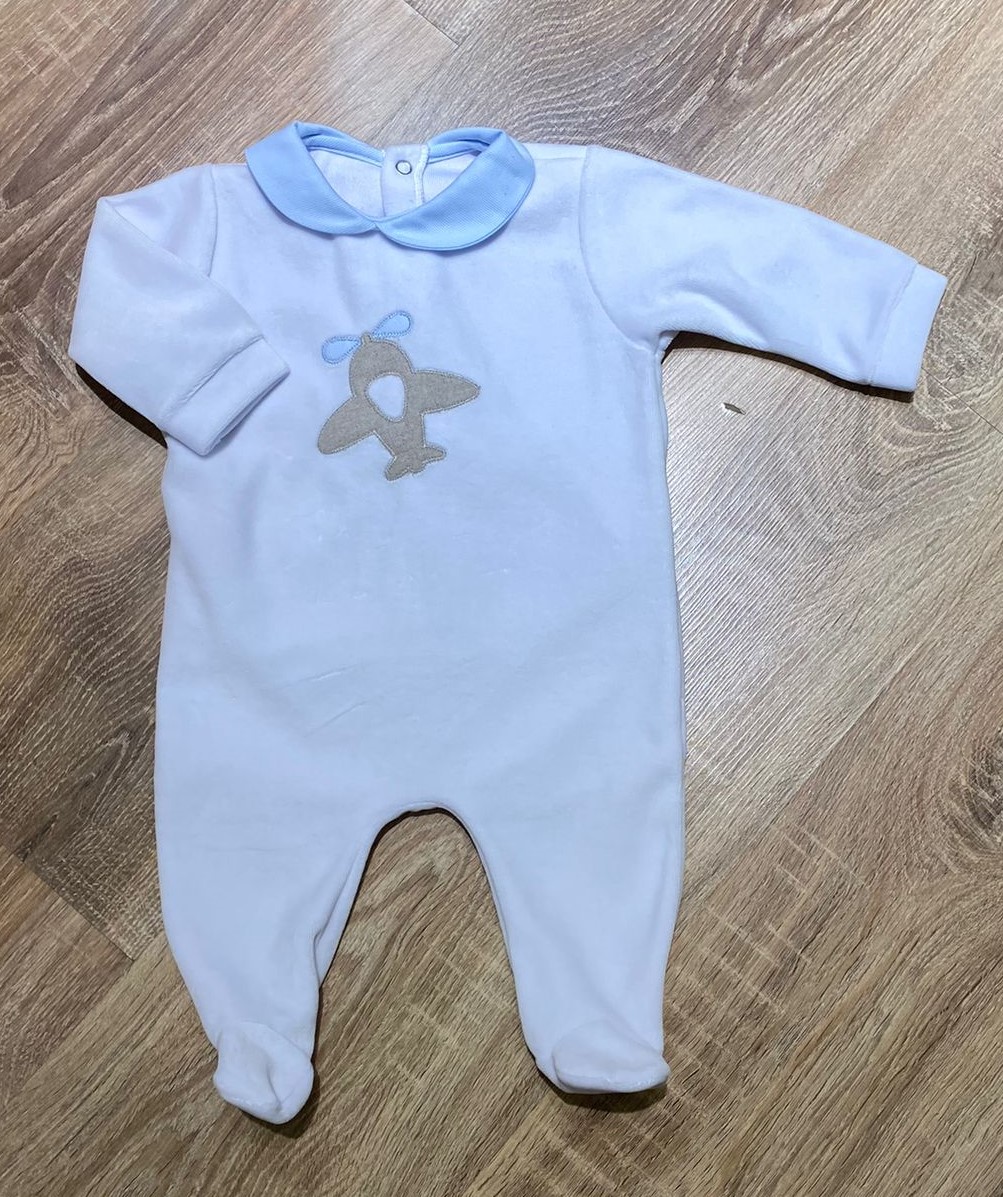 Tutina in ciniglia colore bianco con collettino celeste e ricamo aereo sulla parte anteriore