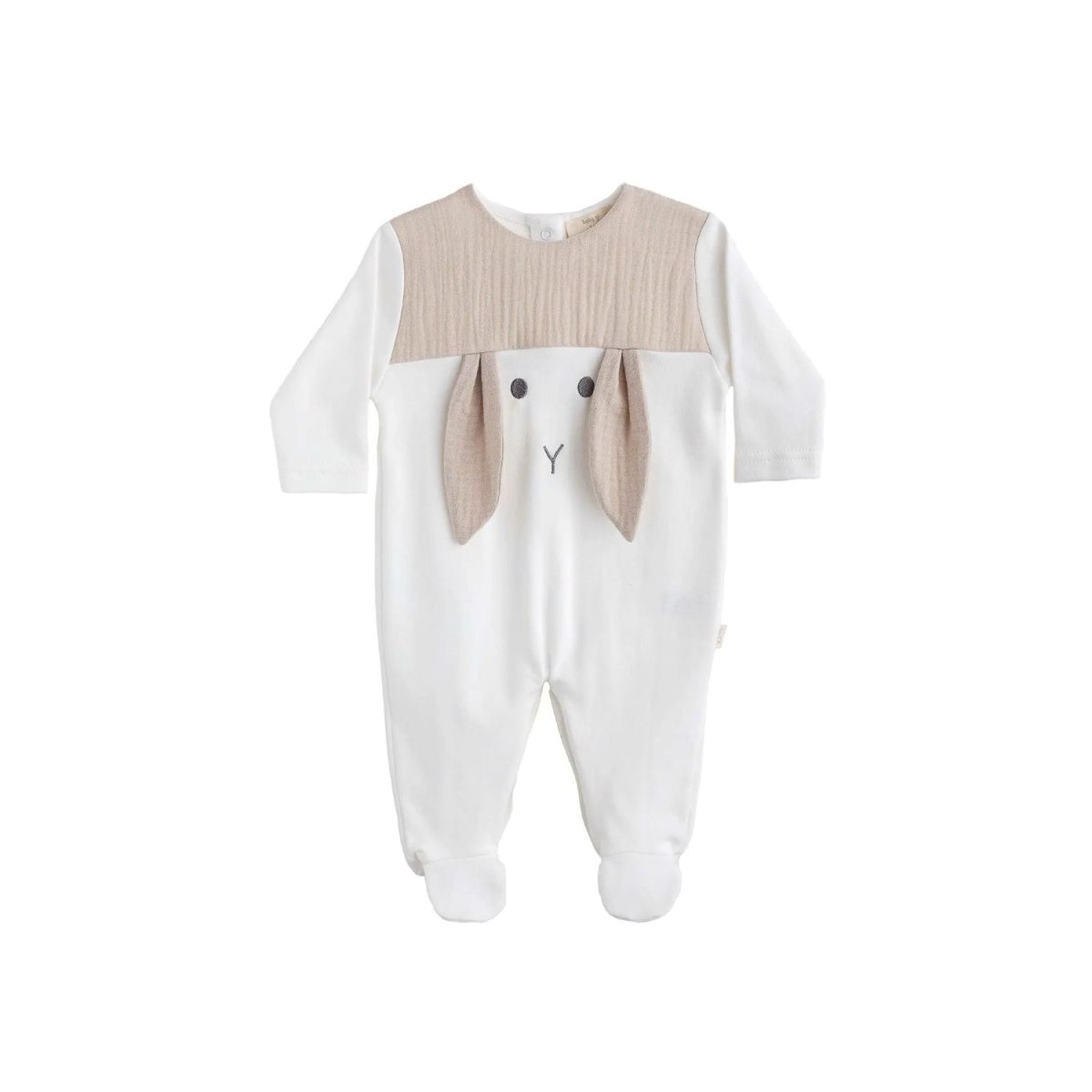 Tutina con piedino, panna con parte superiore e simpatiche orecchie da coniglietto tortora, con occhi e nasino ricamati, abbottonatura posteriore