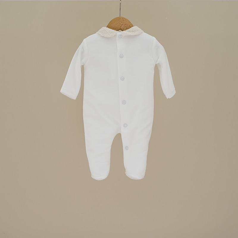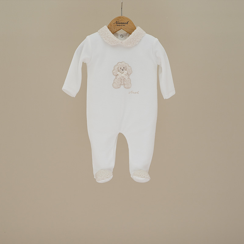 Tutina intera con piedino in ciniglia colore panna con colletto, piedini e cagnolino in tessuto sherpa. Chiusura con bottoncini a clip nella parte posteriore