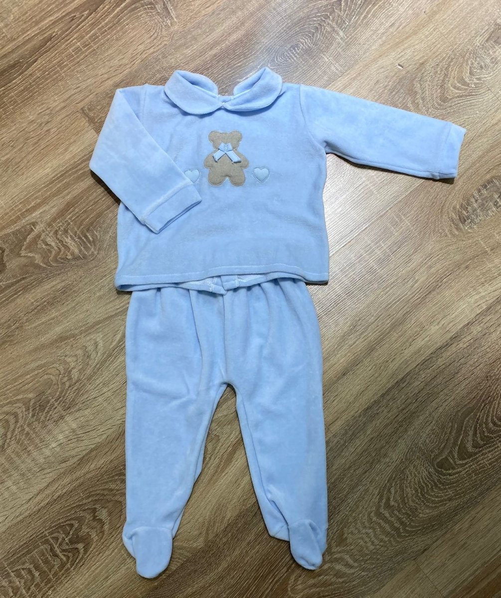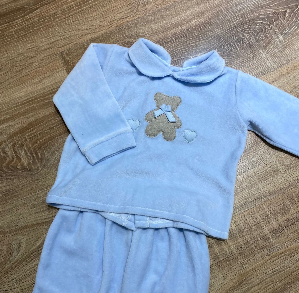 Tutina due pezzi in ciniglia colore celeste con ricamo cuoricini e orsetto