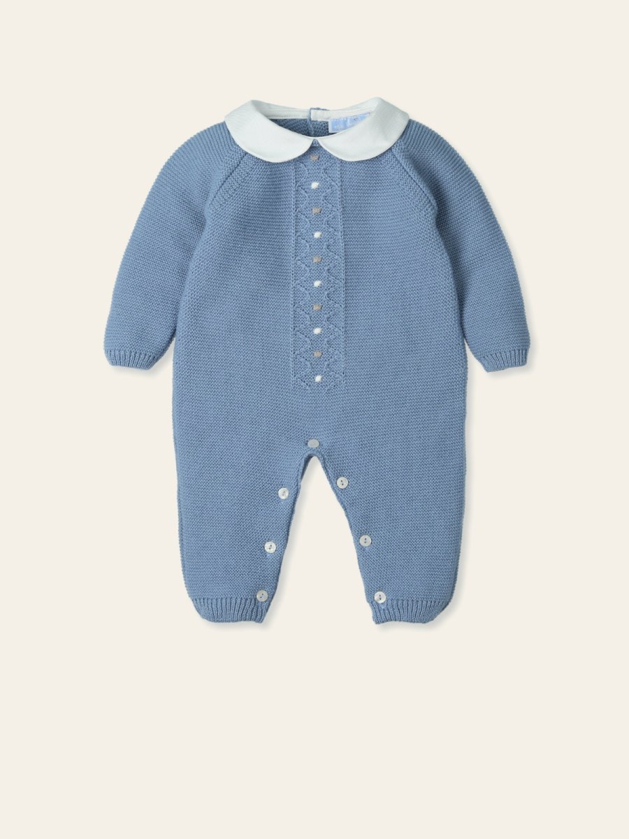 Tutina in misto lana colore celeste polvere con colletto bianco e ricami bianchi e grigi