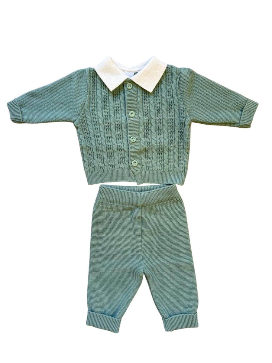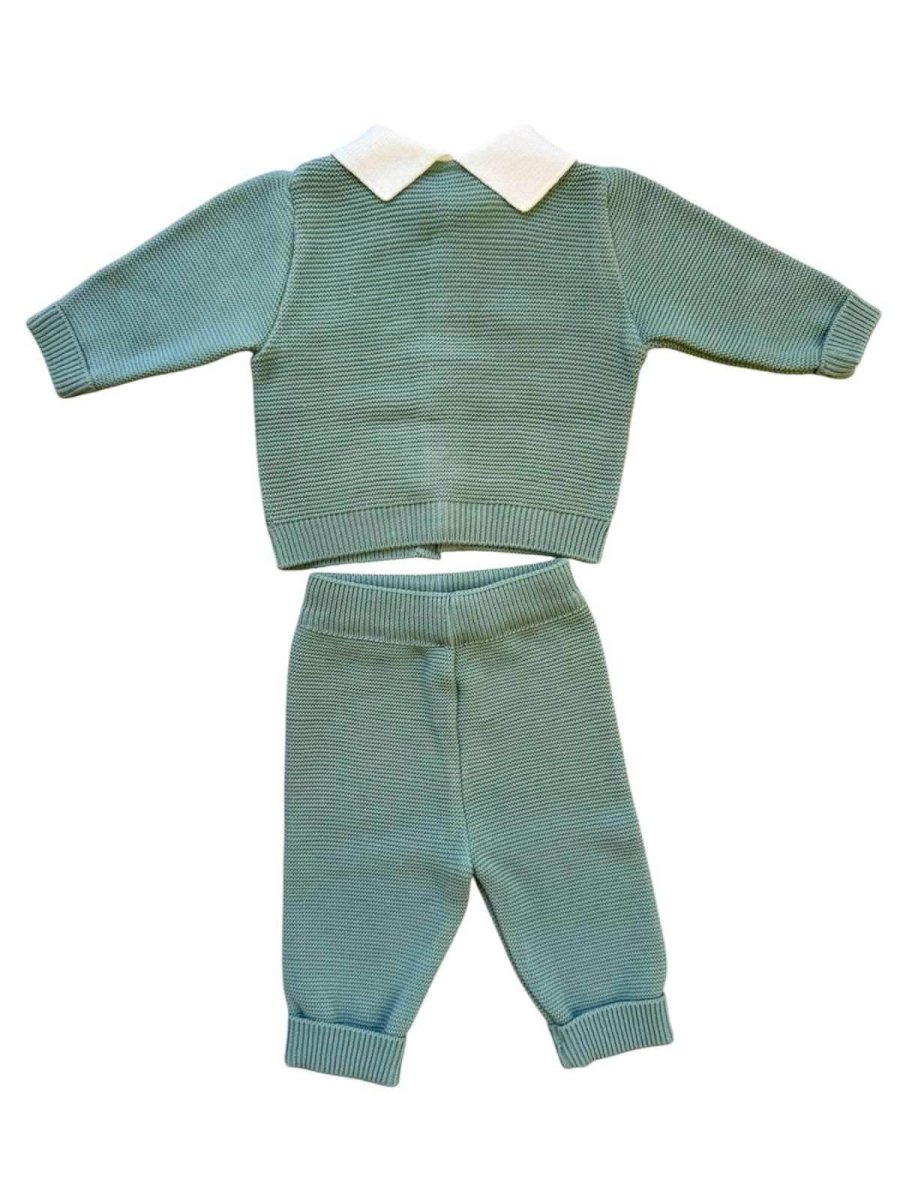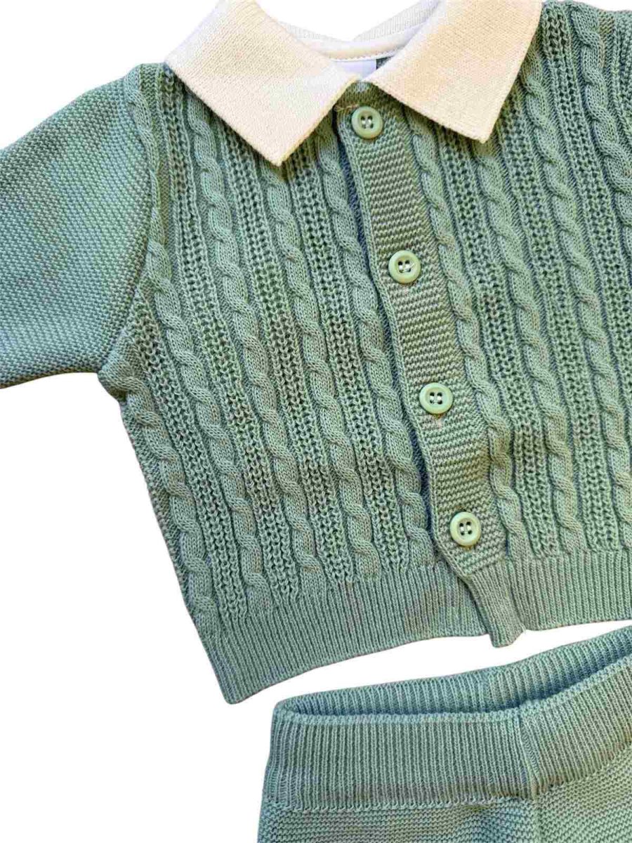 Tutina due pezzi composta da maglietta e pantalone misto lana verde, con colletto bianco, abbottonatura nella parte anteriore, trama intreccio.