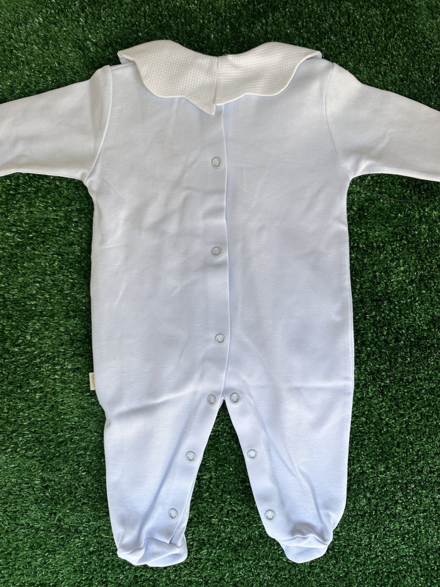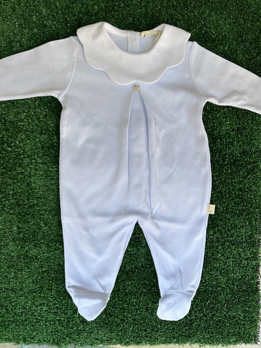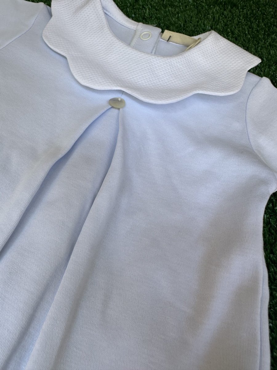 Tutina lunga con piedino,in cotone organico, celeste con colletto bianco