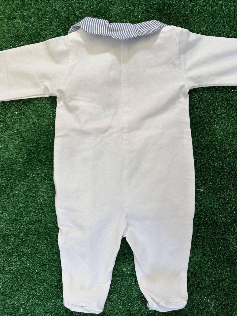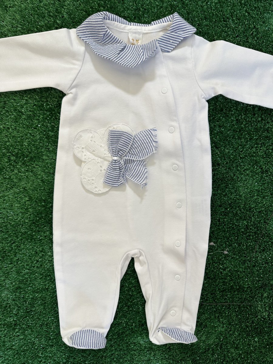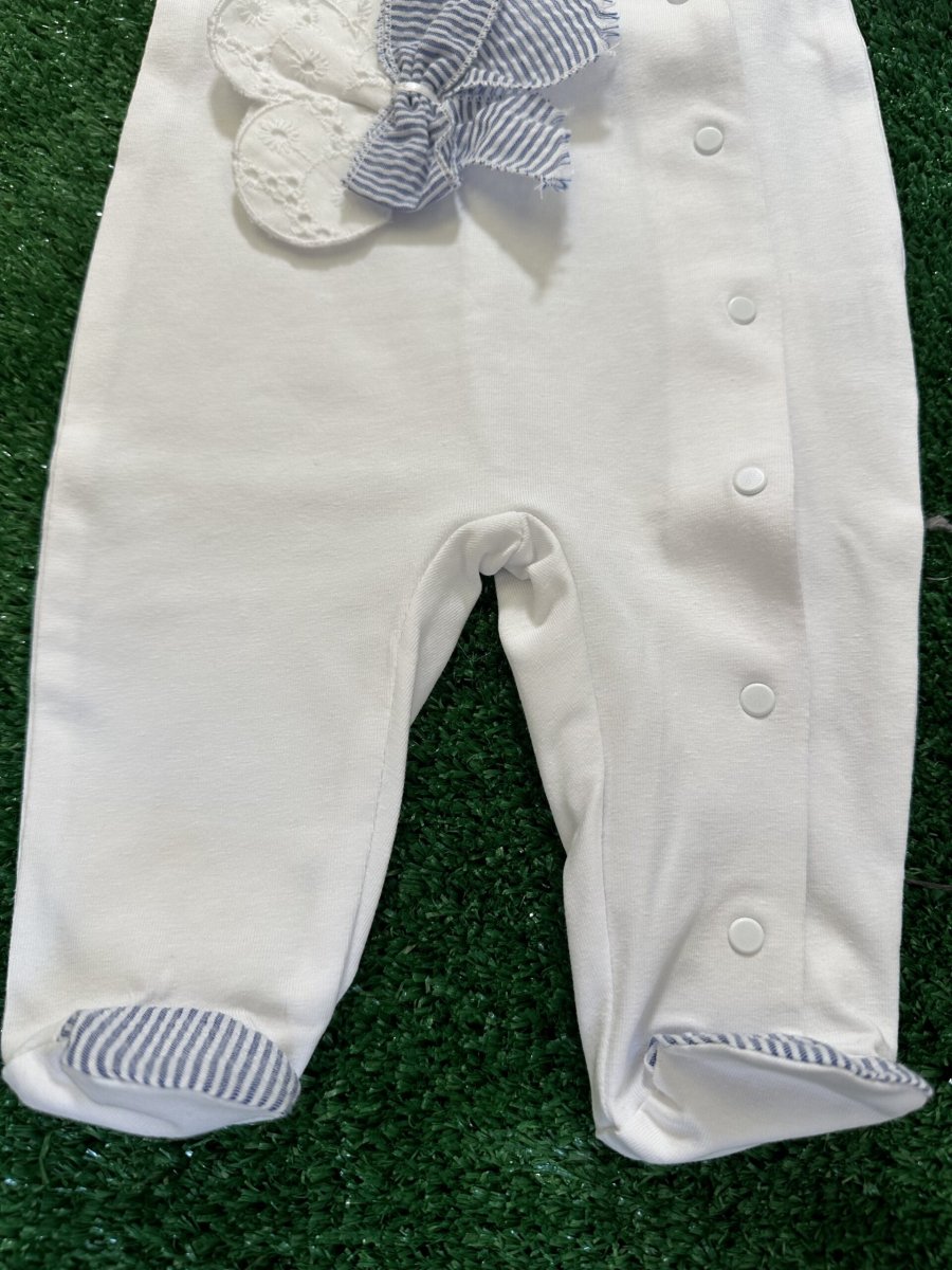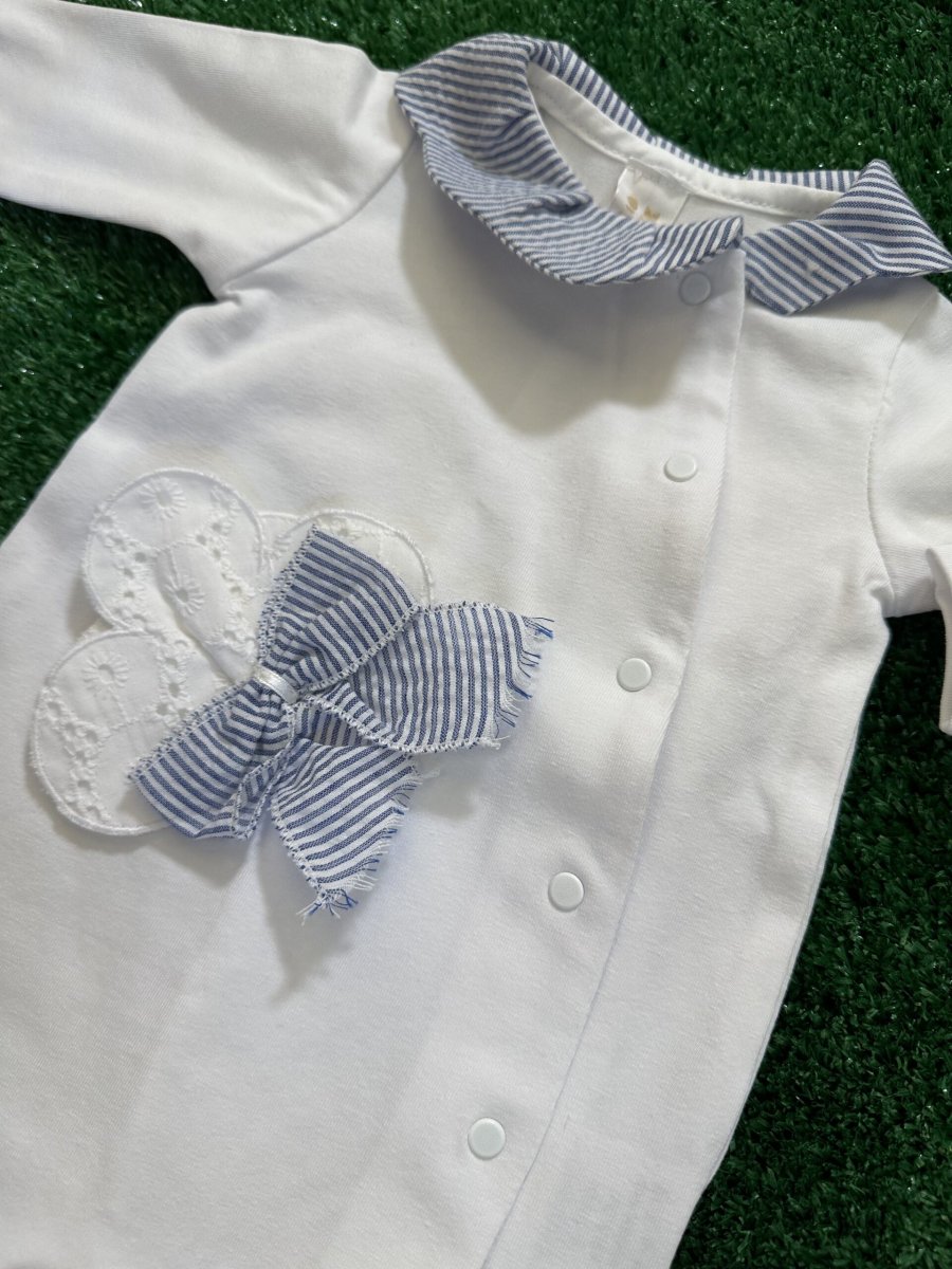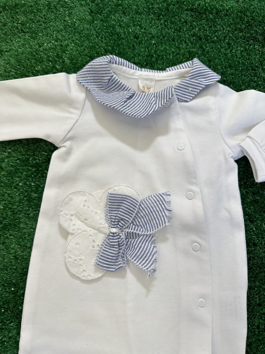 Tutina lunga con piedino in cotone organico, bianca con colletto e piedino a righe, applicazione di fiocco in pizzo san gallo e fiocco a righe