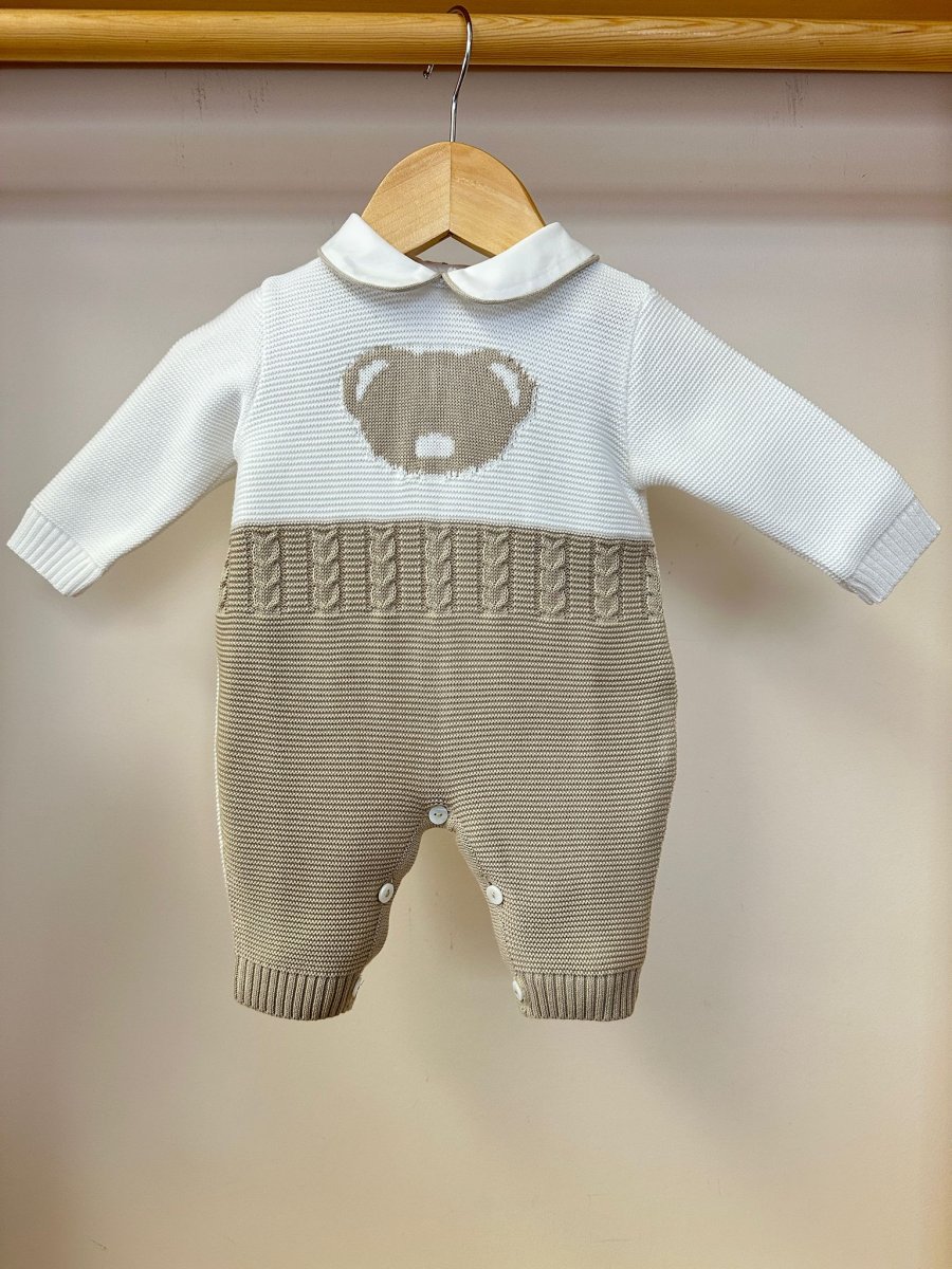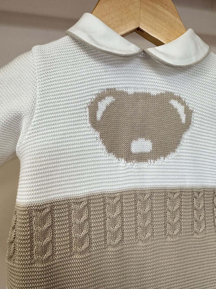 Tutina intera colore bianco in filo di scozia con ricami orsetto e trecce tortora