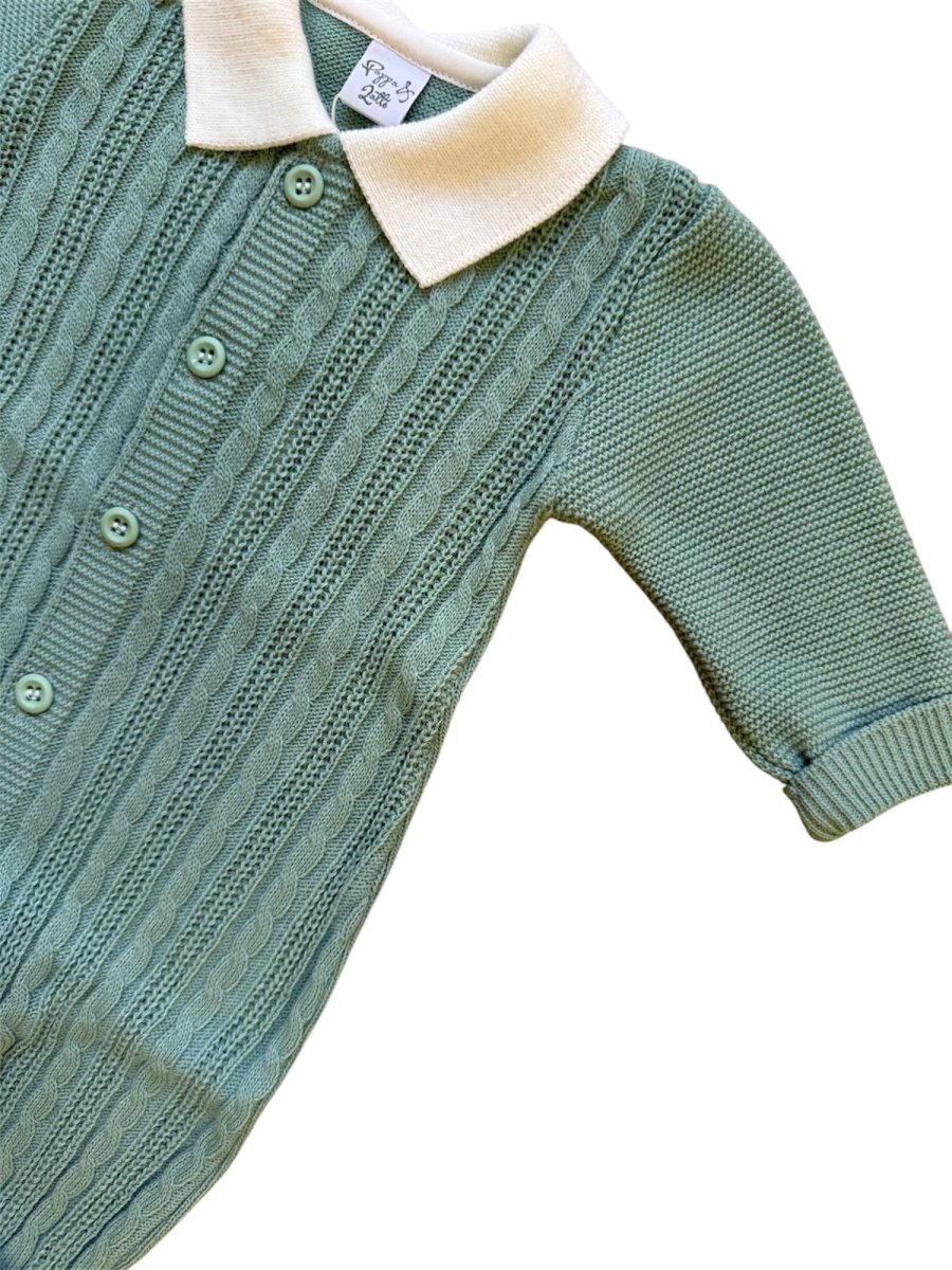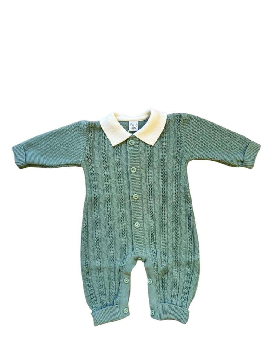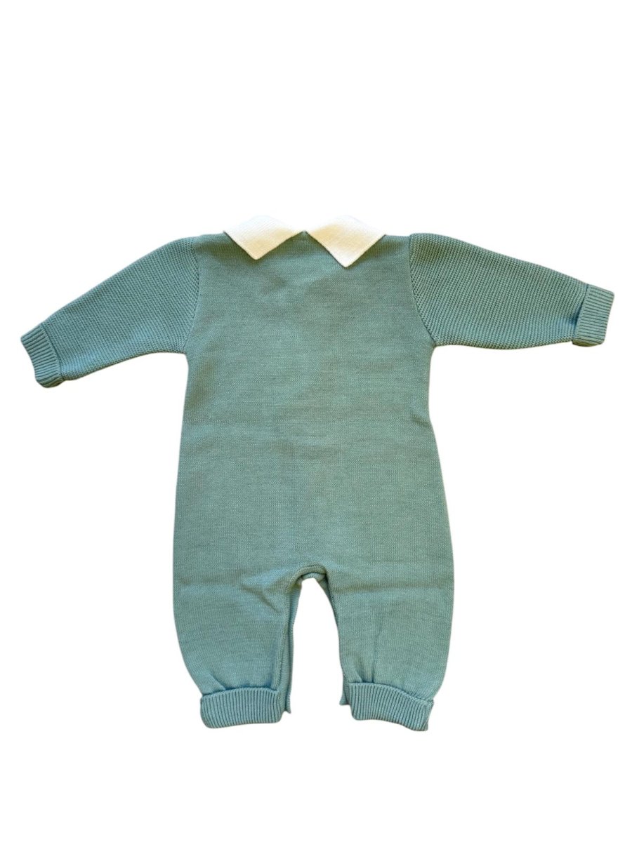 Tutina misto lana verde, con colletto bianco, abbottonatura nella parte anteriore, trama intreccio.