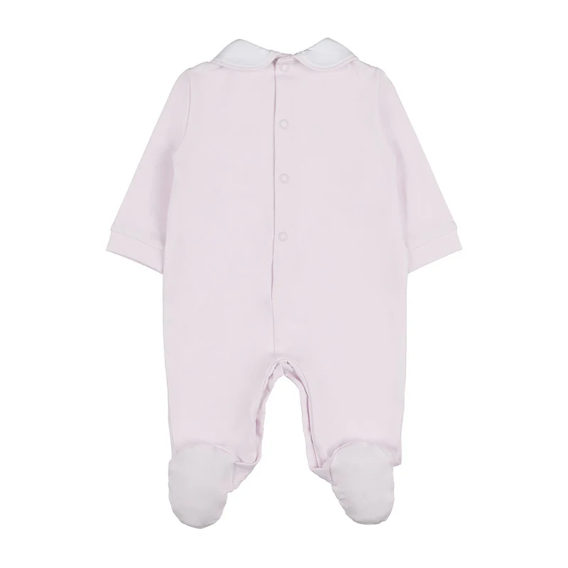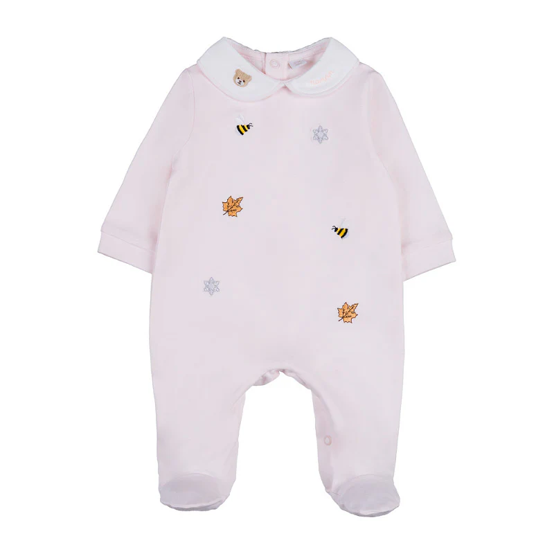Tutina intera colore rosa in caldo cotone organico con ricami api, foglie e fiocchi di neve e colletto bianco con ricamo orsetto e scritta โnananโ
