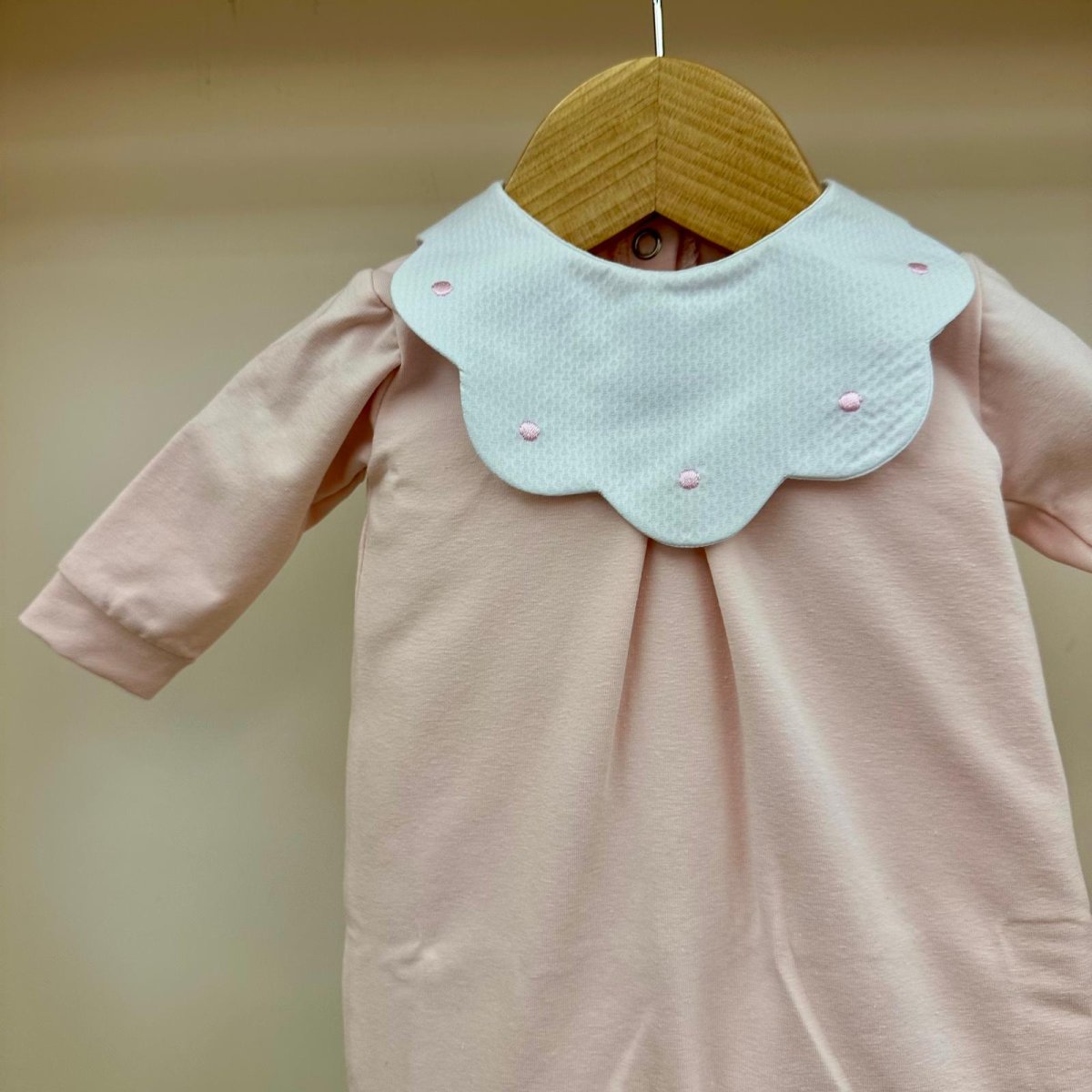 Tutina in cotone rosa baby con colletto bianco a forma di margherita e pois ricamati con piega baciata sul davanti, Pappa e Latte