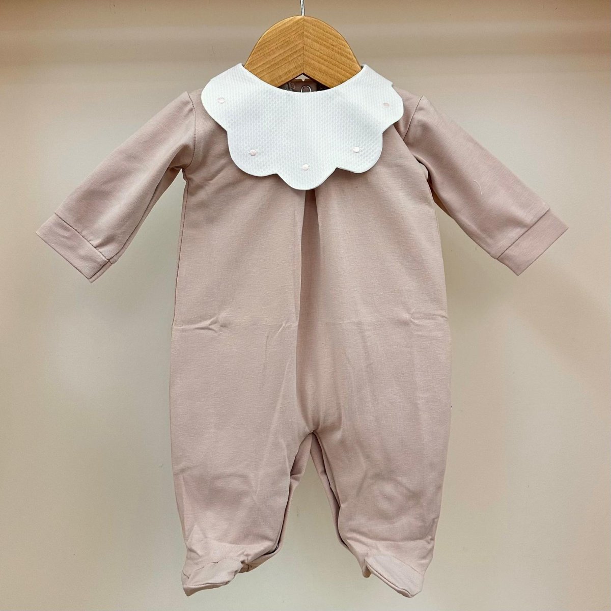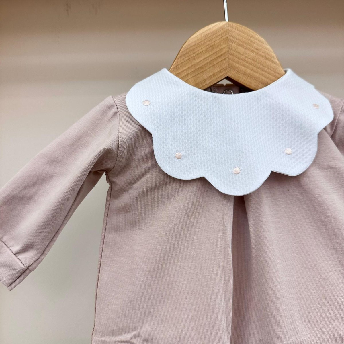 Tutina in cotone rosa cipria con colletto bianco a forma di margherita e pois ricamati con piega baciata sul davanti, Pappa e Latte