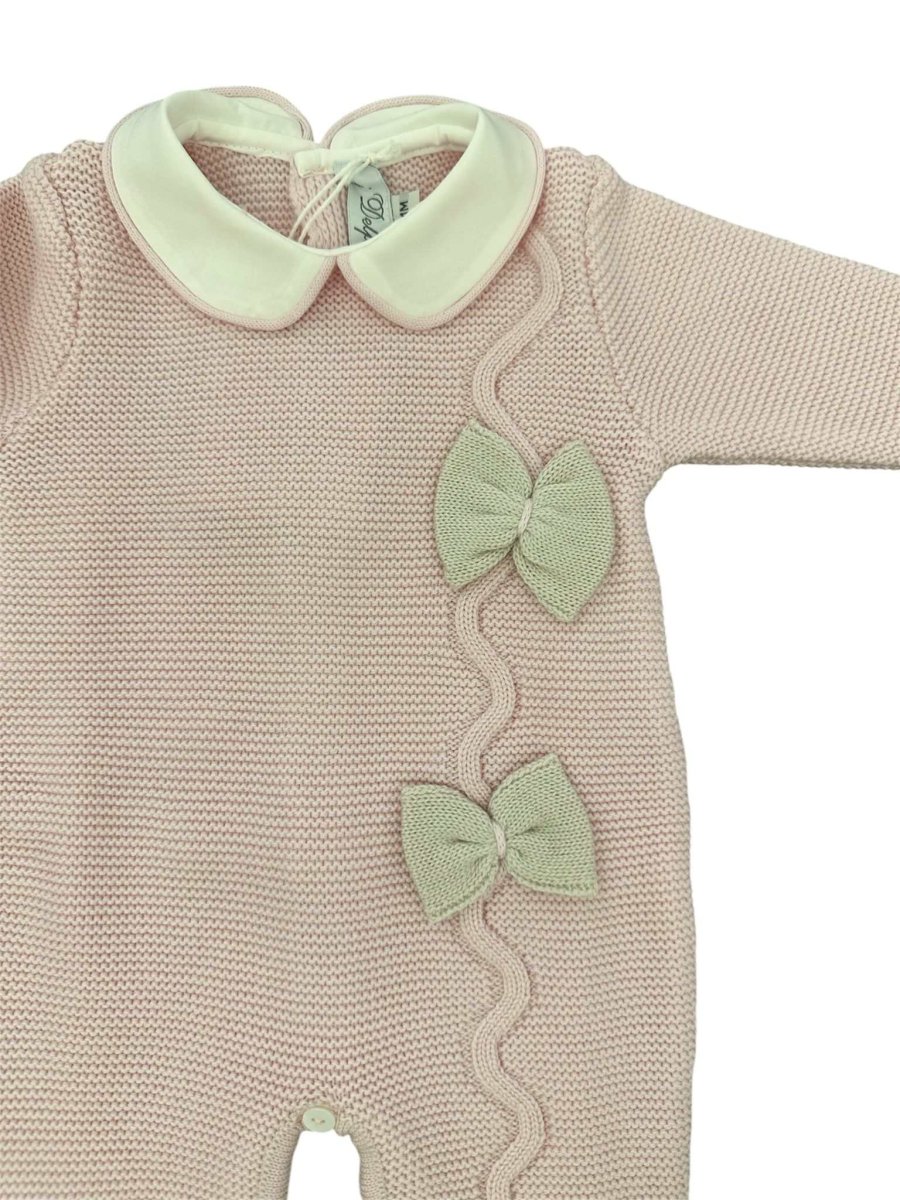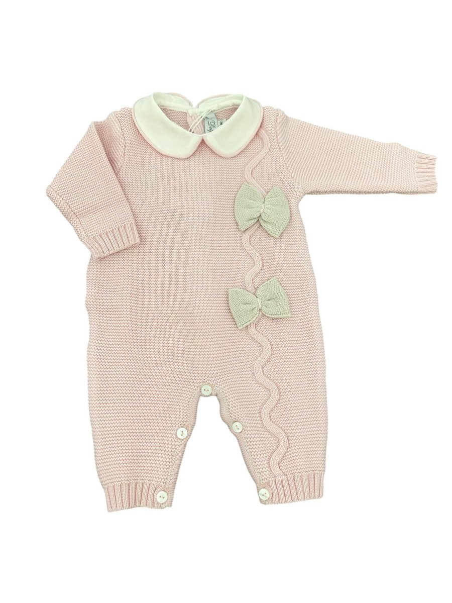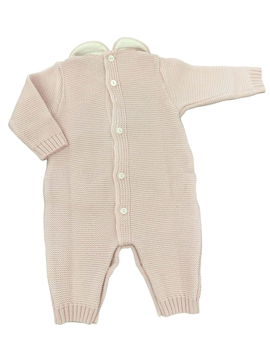 Tutina intera in pura lana (100%) colore rosa con fiocchi beige applicati sul davanti, collettino in cotone bianco, chiusura con bottoncini nella parte posteriore e inferiore
