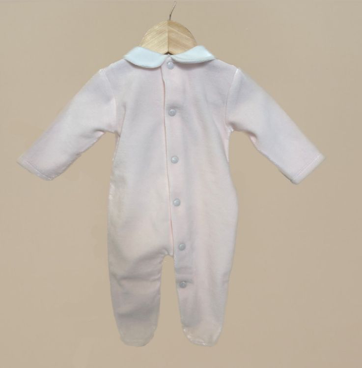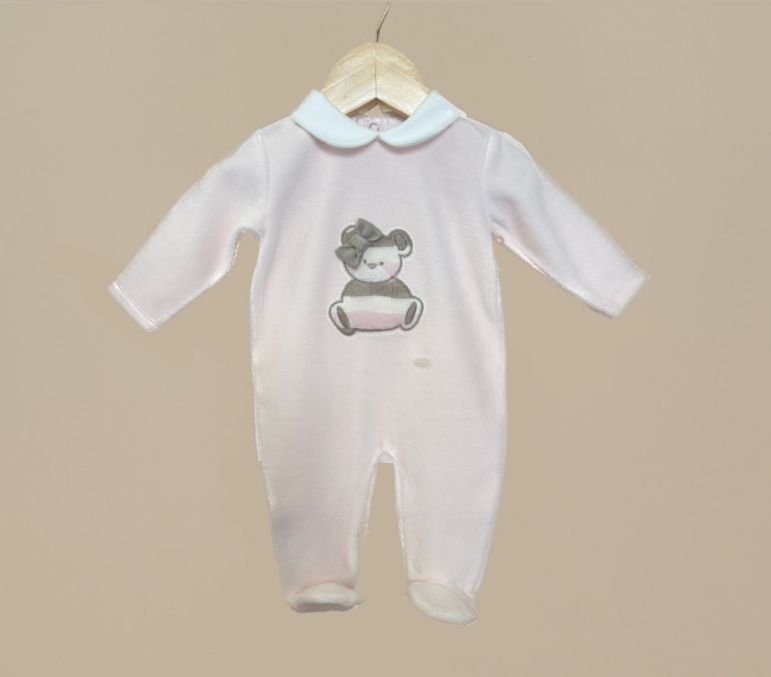 Tutina in ciniglia, colore rosa, con orsetto colorato beige rosa e panna ricamato sul davanti con fiocco applicato, colletto bianco