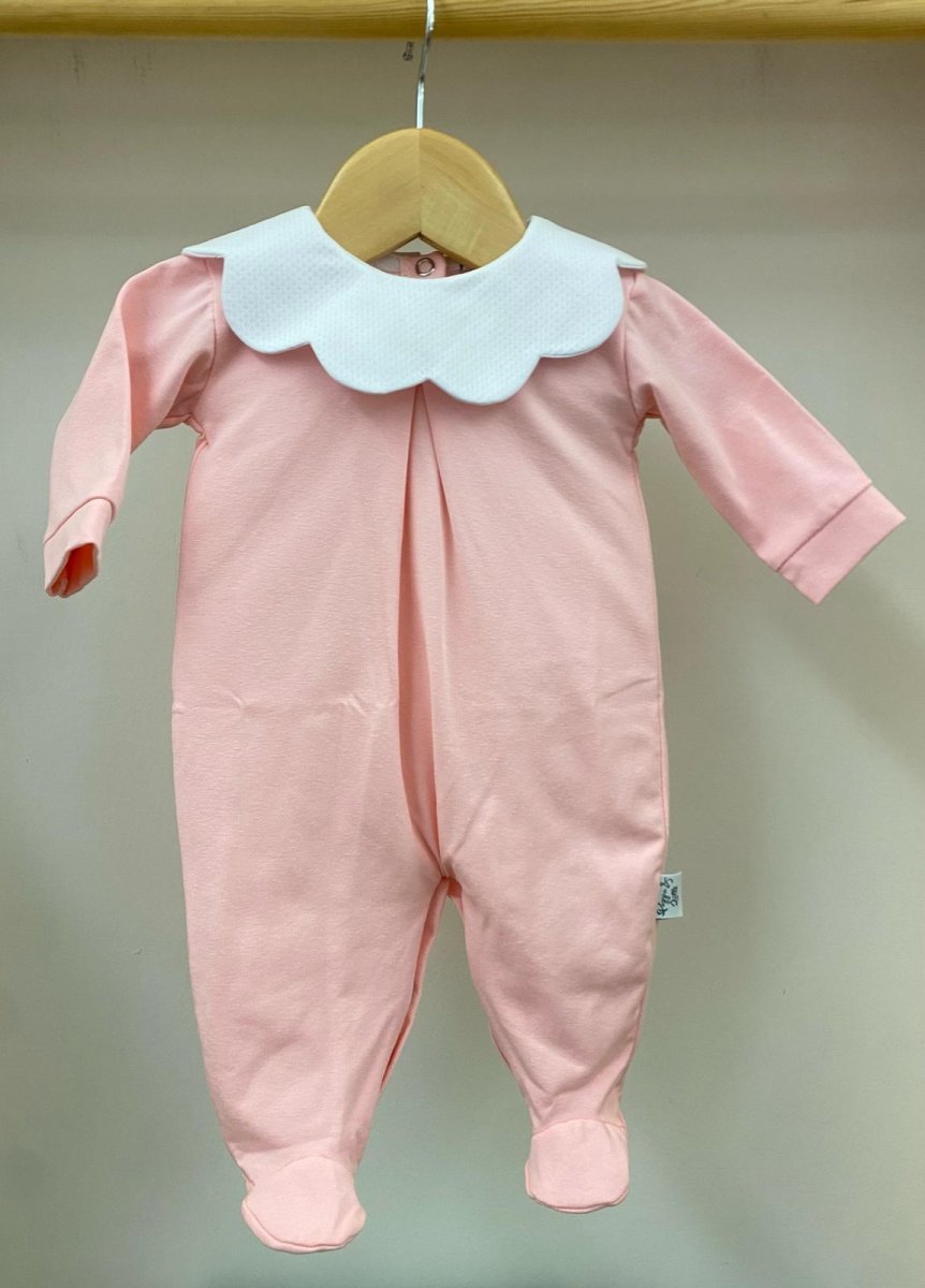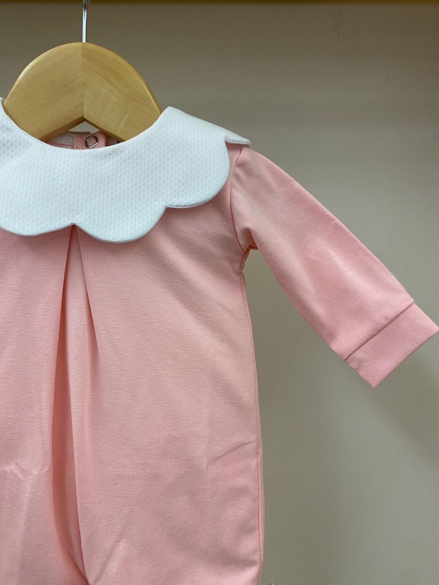 Tutina in cotone rosa, con colletto bianco a forma di nuvola e piega baciata sul davanti, Pappa e Latte