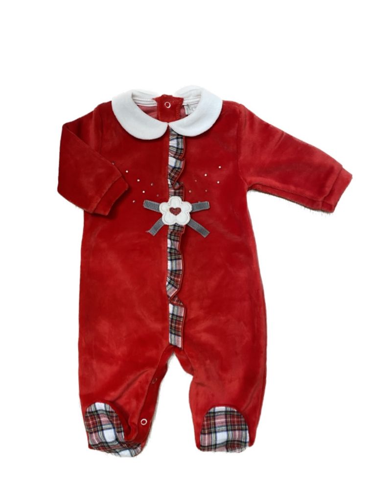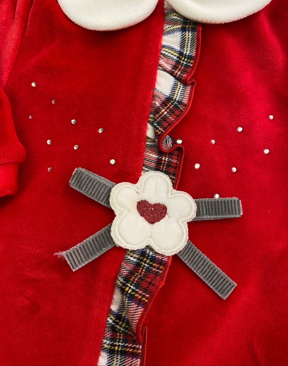Tutina intera in ciniglia colore rosso con dettagli tartan e fiorellino bianco con strass