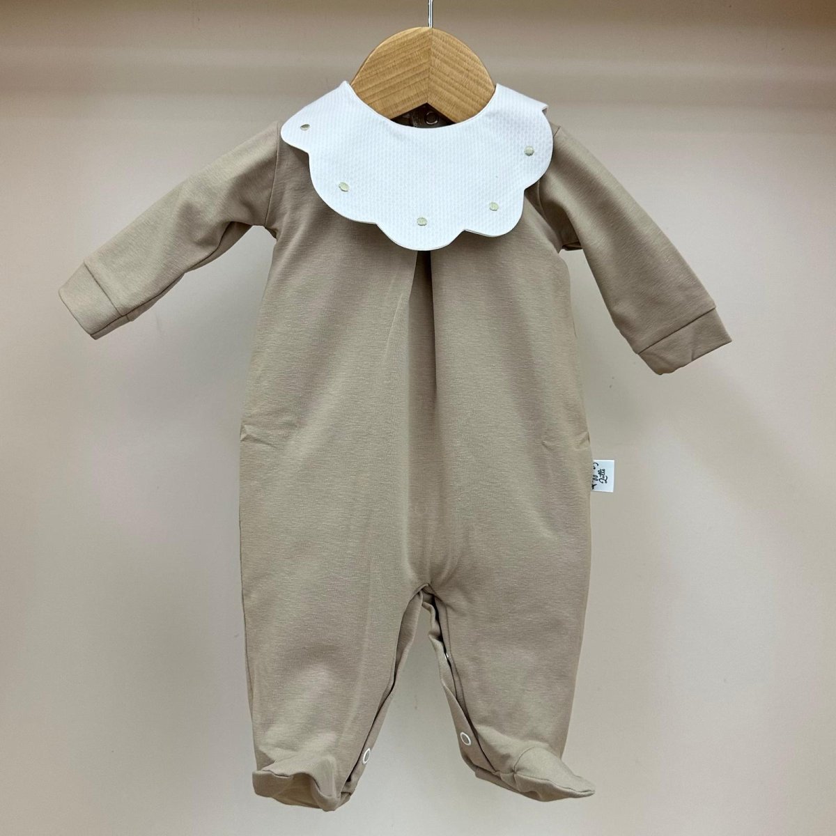 Tutina in cotone tortora con colletto bianco a forma di margherita e pois ricamati con piega baciata sul davanti, Pappa e Latte