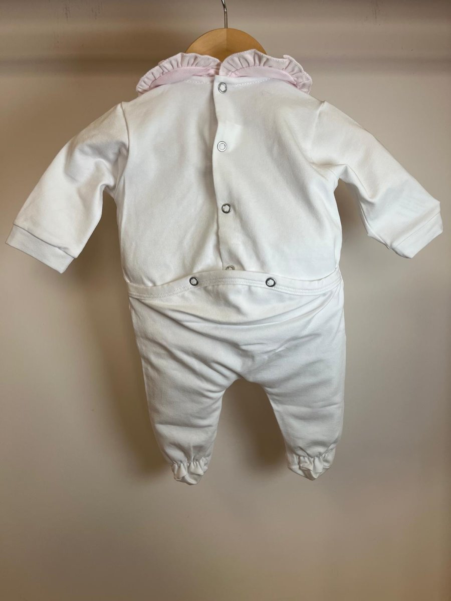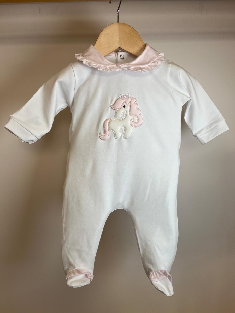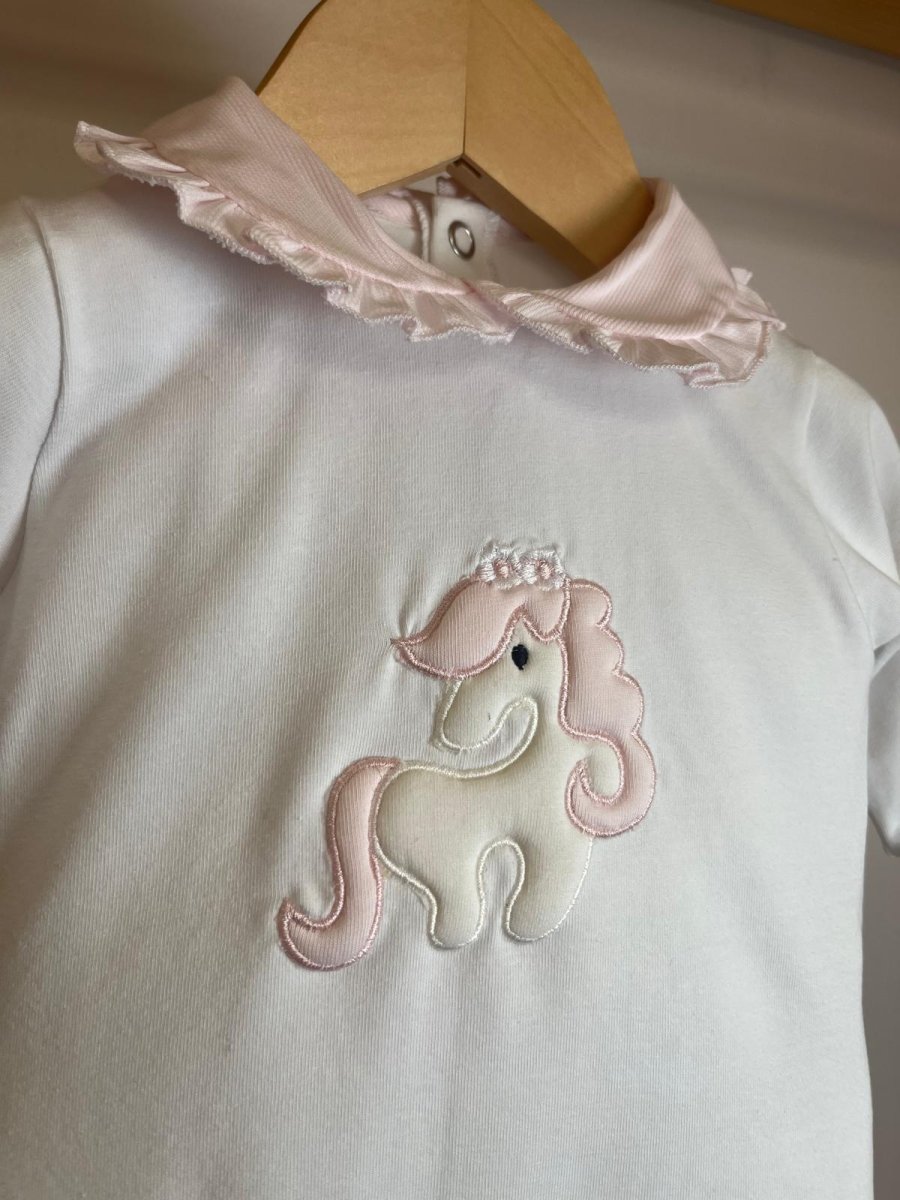 Tutina in cotone, intera bianco, unicorno e colletto rouches rosa