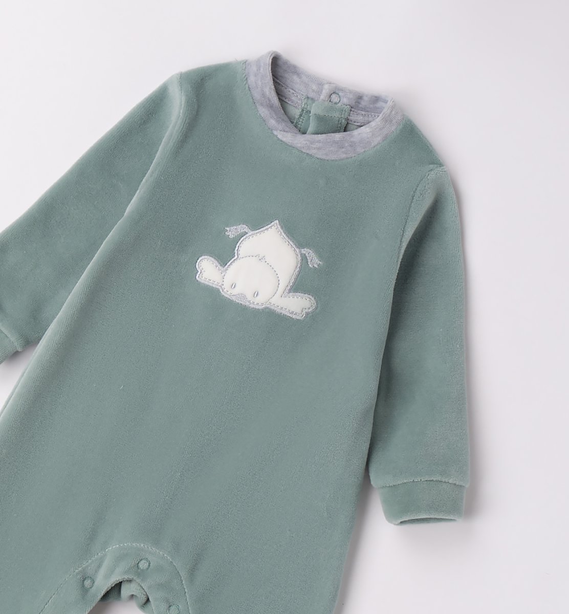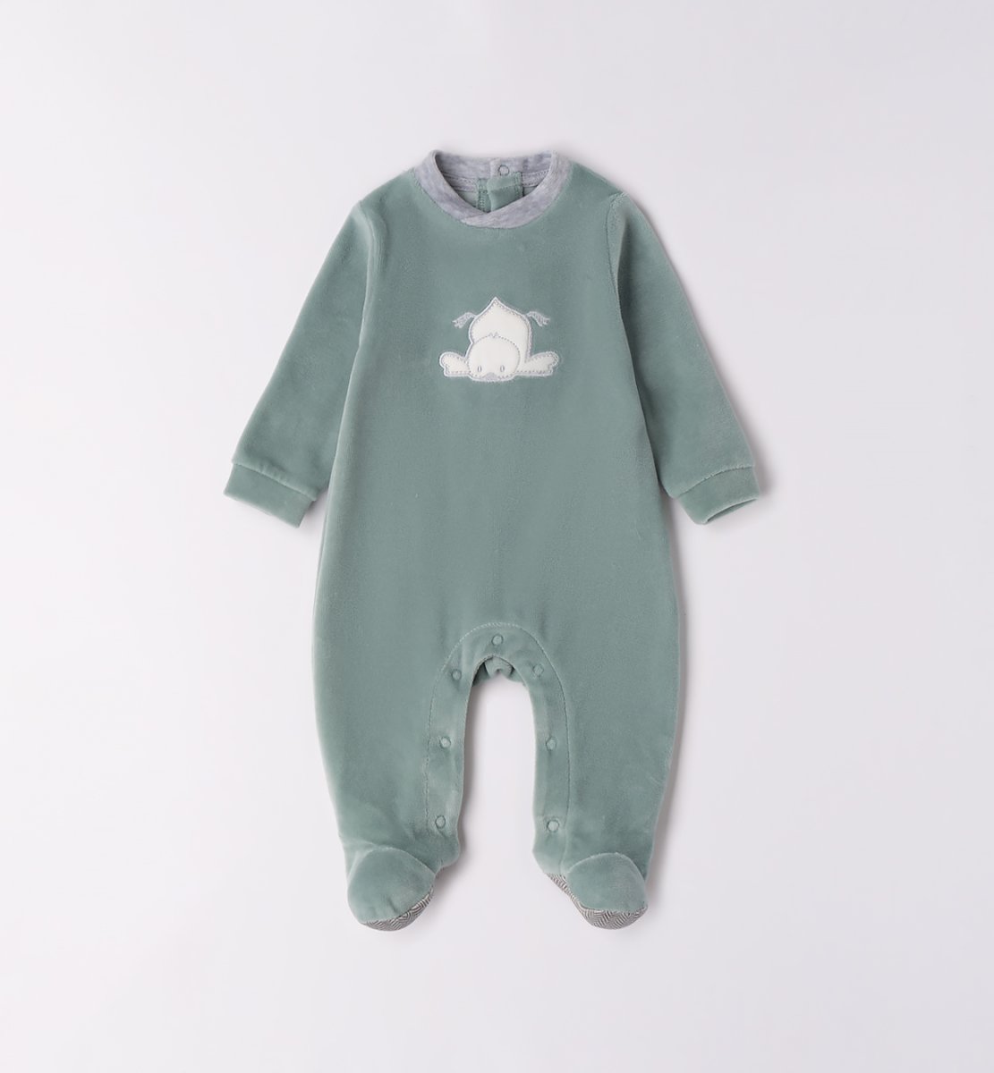 Tutina intera in ciniglia colore verde acqua con ricamo pulcino, toppe sui gomiti, colletto colore grigio e chiusura con bottoncini