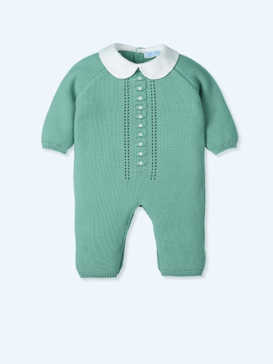 Tutina in misto cotone, colore verde smeraldo con colletto bianco, ricamo sulla parte frontale