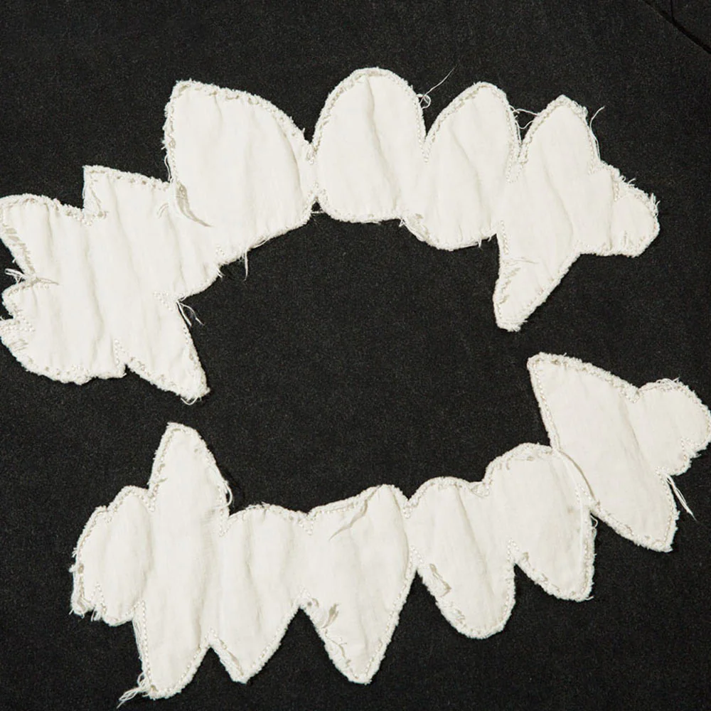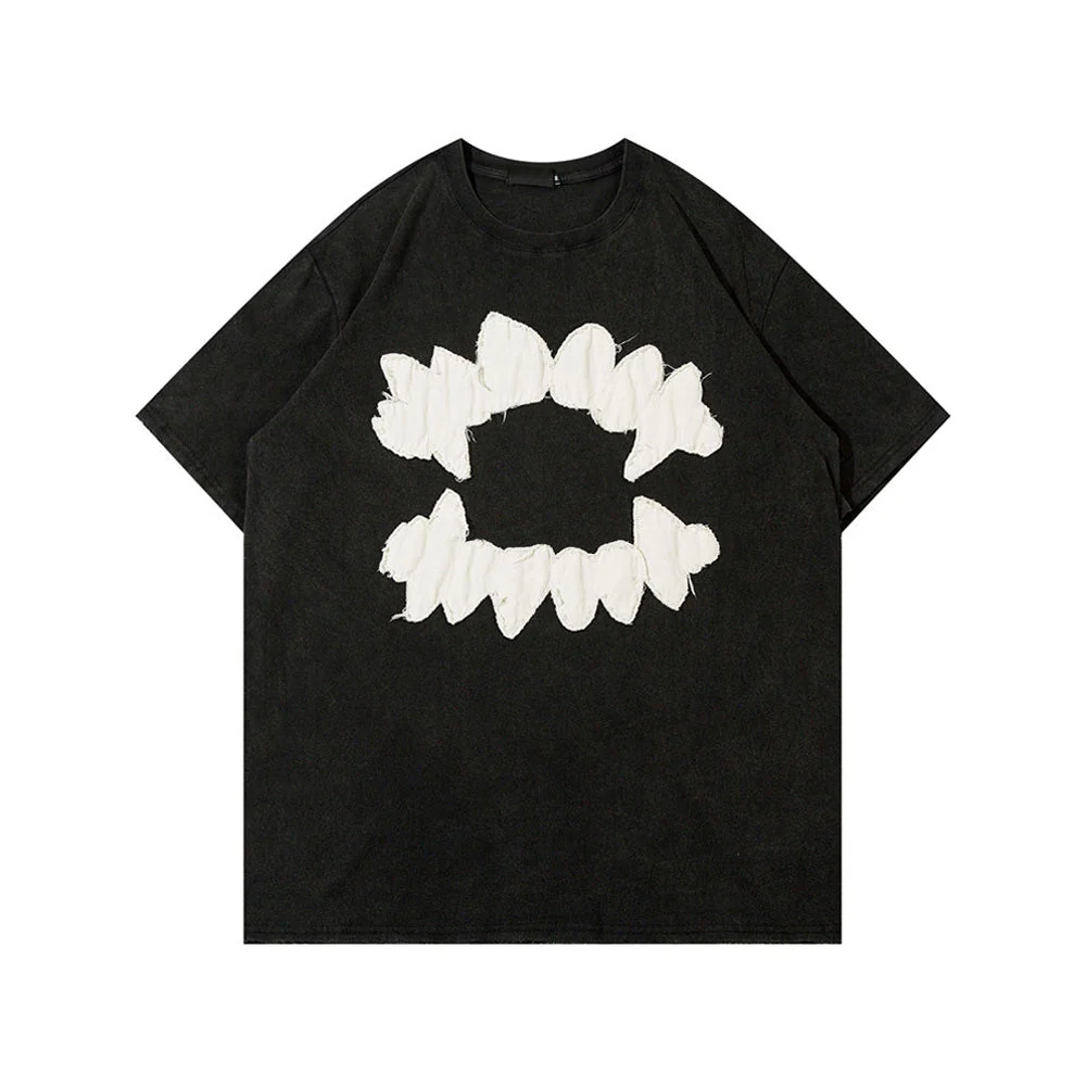 This Vampire Teeth distressed t-shirt is made from 100% cotton, ensuring both comfort and durability. The relaxed fit and washed look add a touch of vintage goth style to your outfit, while the bold vampire teeth patch on the front is sure to turn heads.
