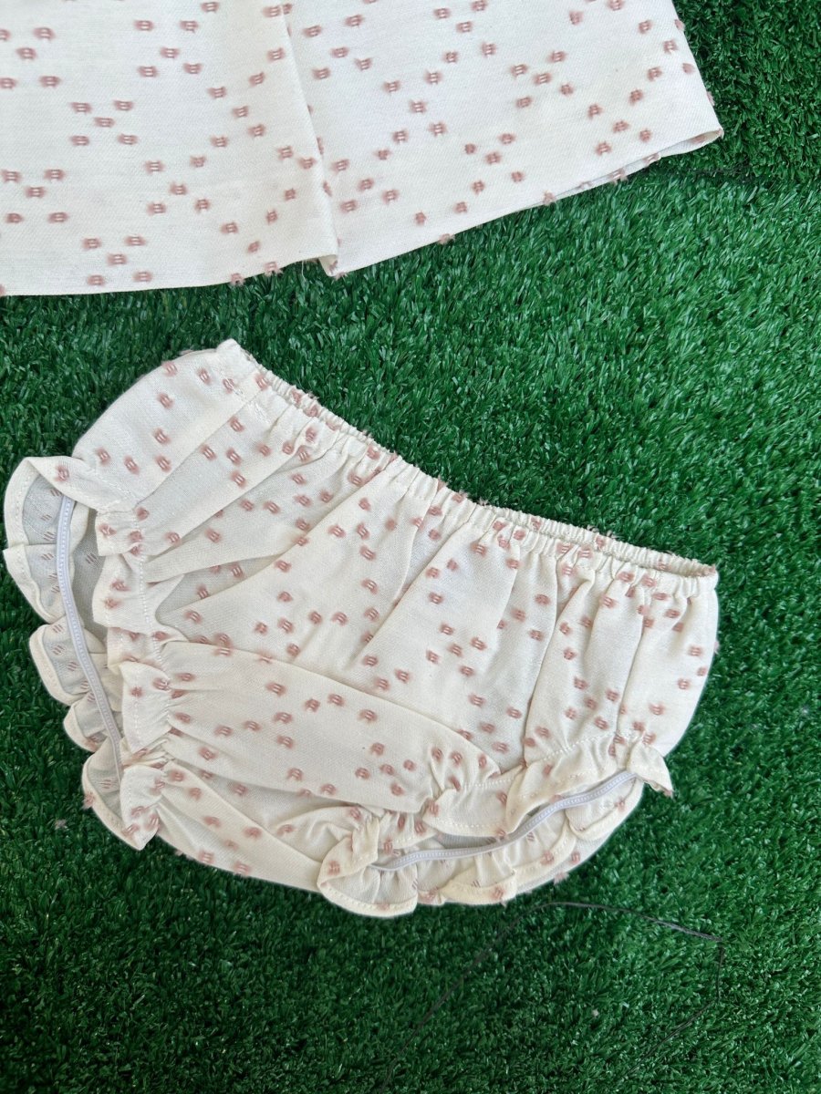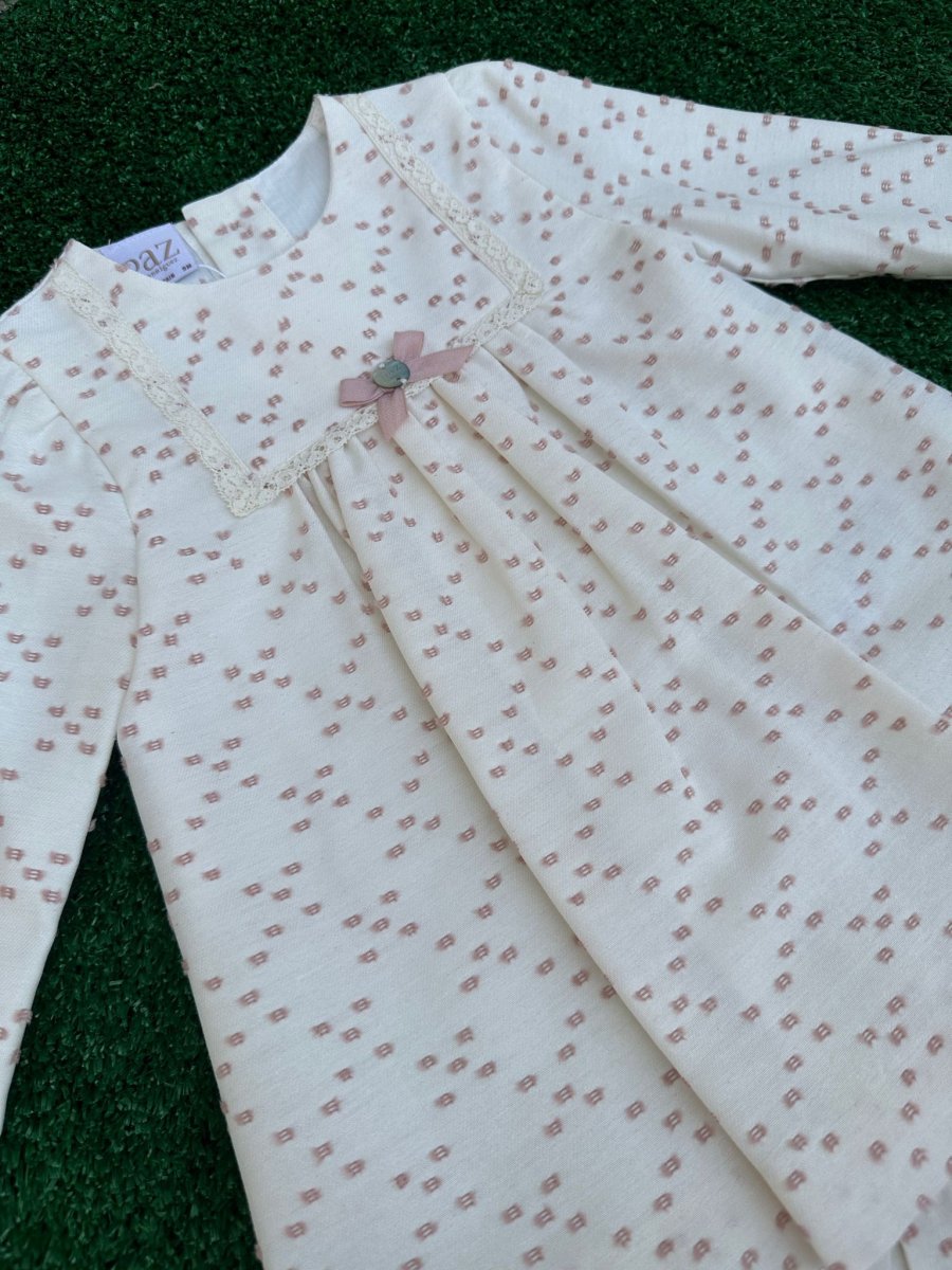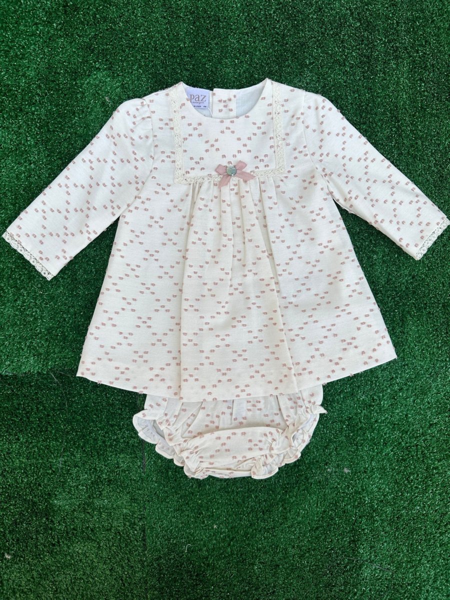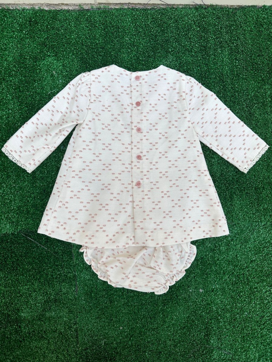 Vestito con culotte in plumetis bianco con ricami rosa cipria e chiusura sul retro con bottoncini