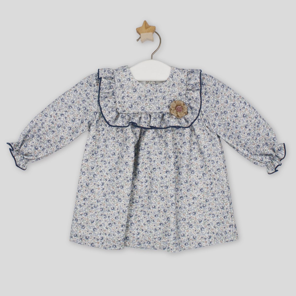 Vestito floreale Rapife colore azzurro, con applicazione fiorellino e chiusura nella parte posteriore con bottoncini a clip.