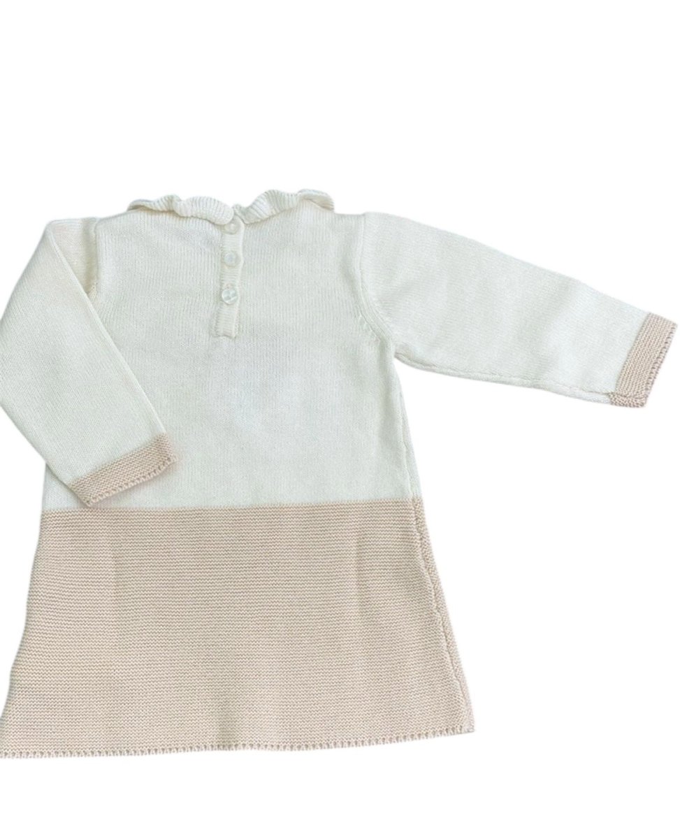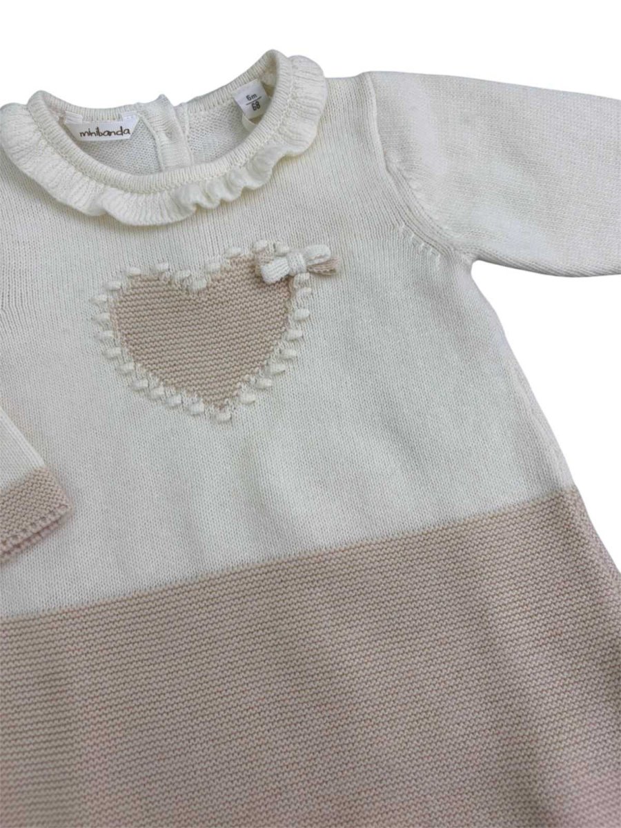 Vestito cuore Minibanda colore panna e beige con ricamo cuore e fiocco, con chiusura bottoncini nella parte posteriore.